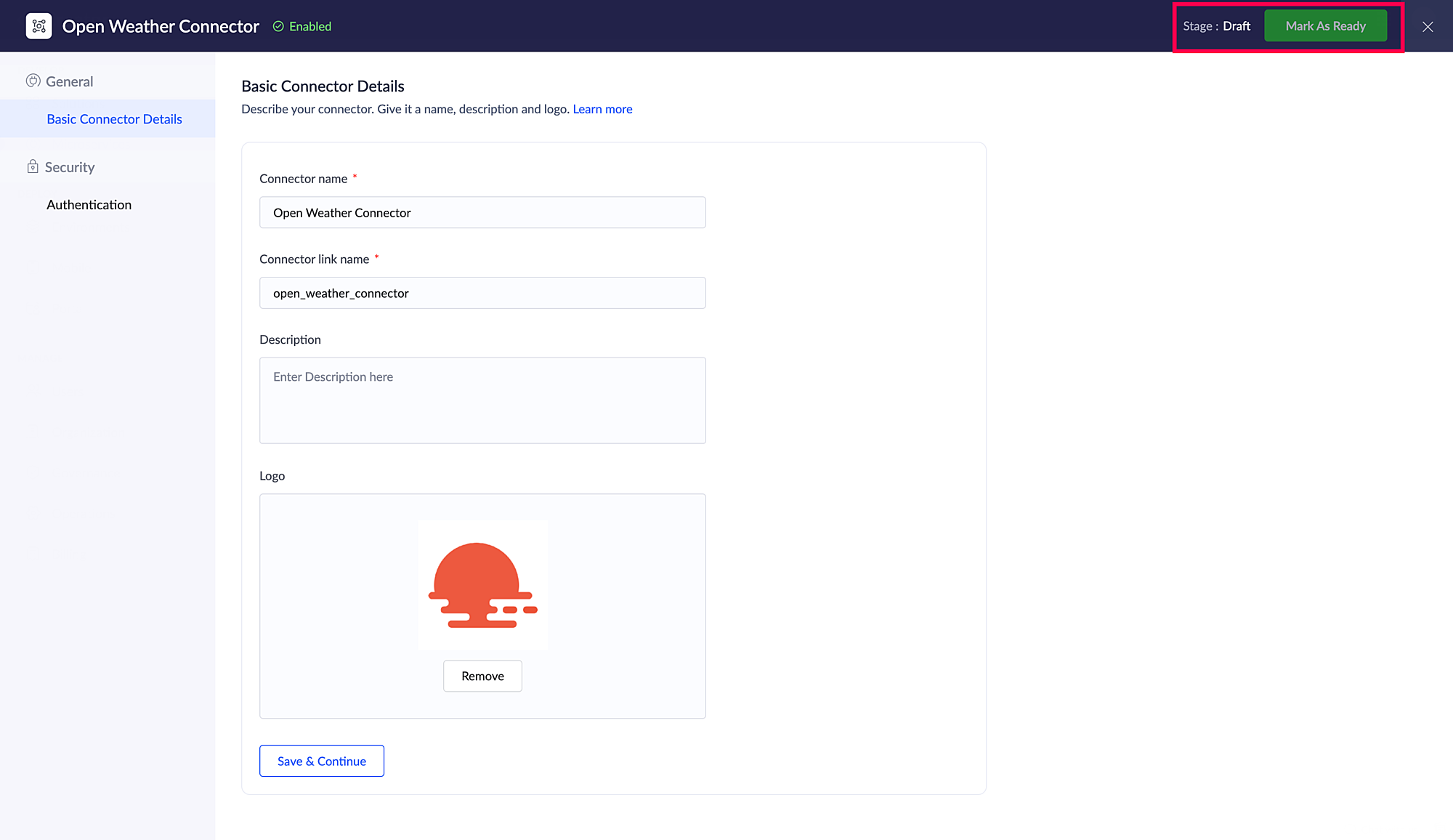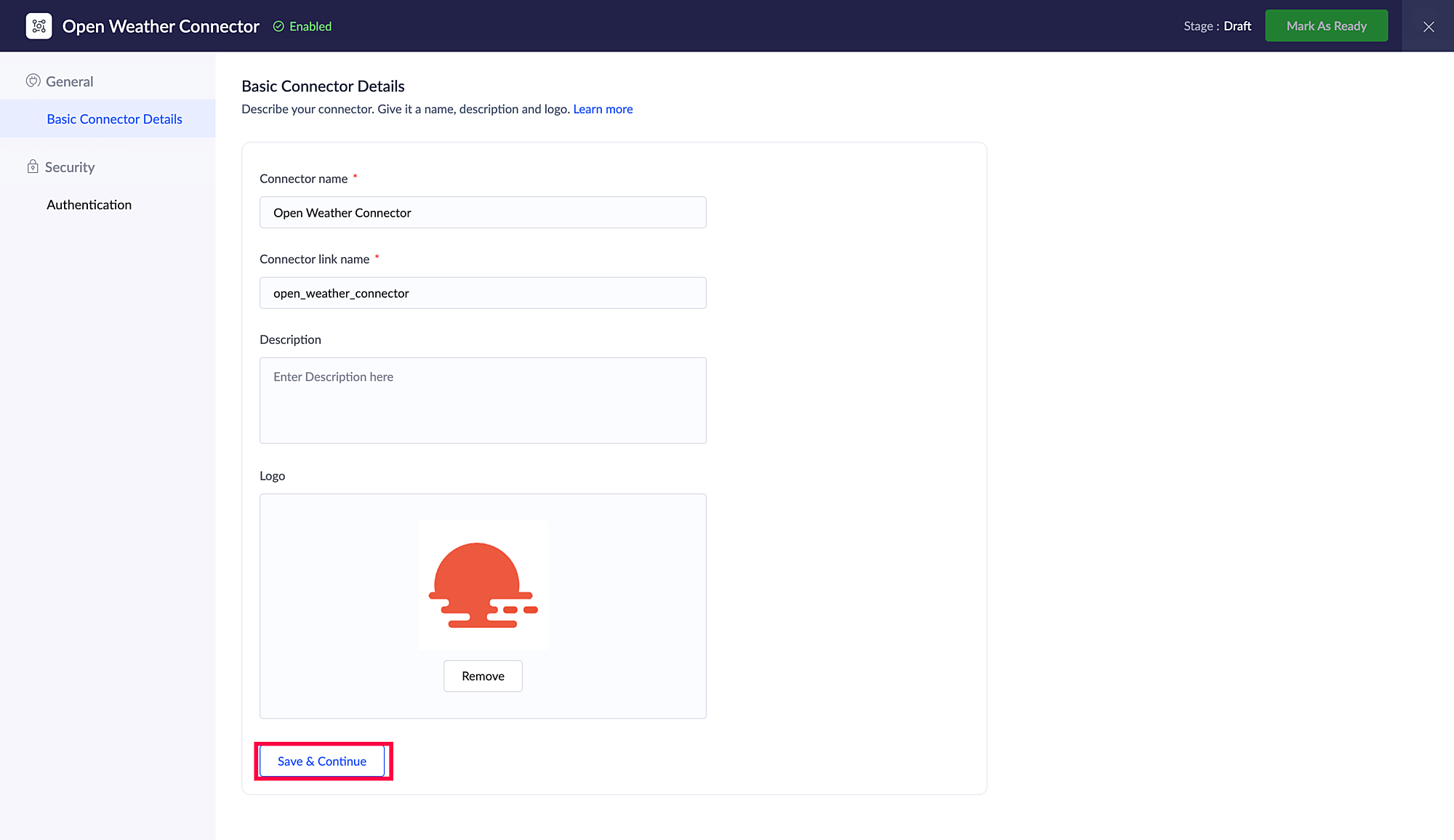 コネクター名、コネクター リンク 名前、および説明は初期画面で自動入力されます。各項目をクリックすることで編集も可能です。