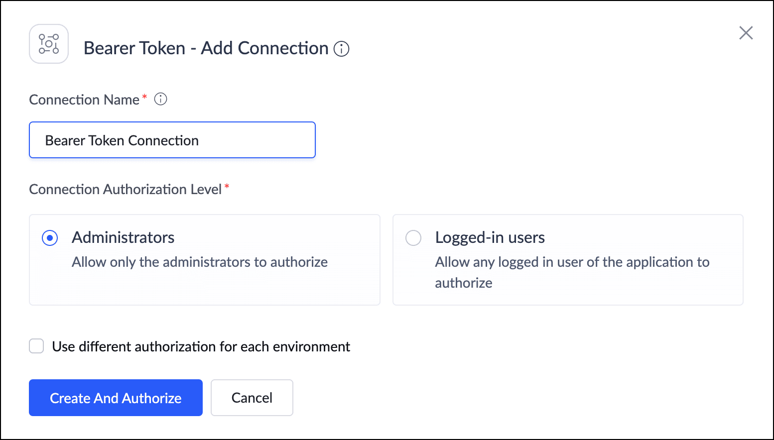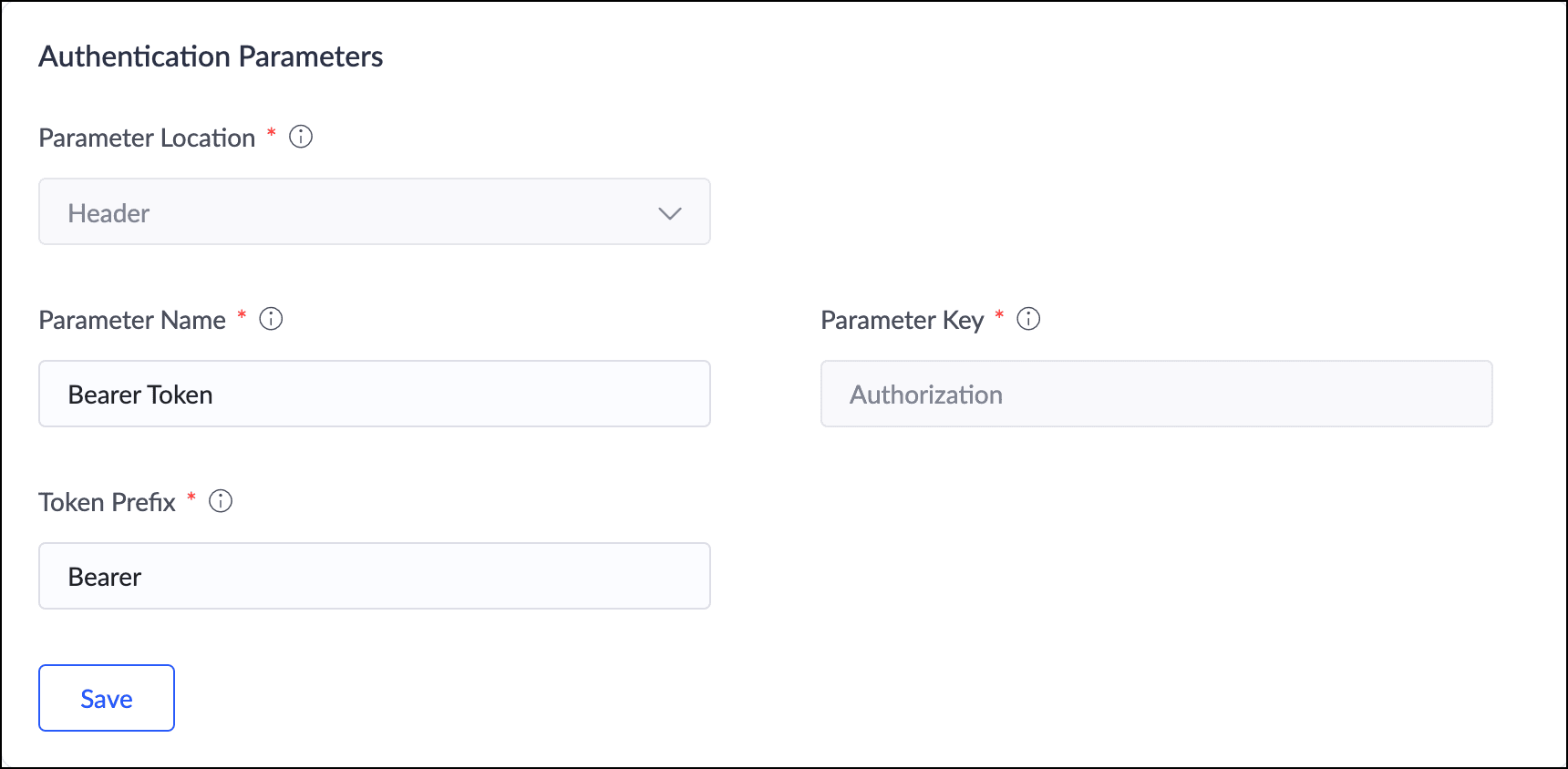 パラメーター名: パラメーターの表示名を設定します。この名前は接続の認証時に入力を求められます。デフォルトで『Bearer Token』と入力されており、カスタマイズ可能です。