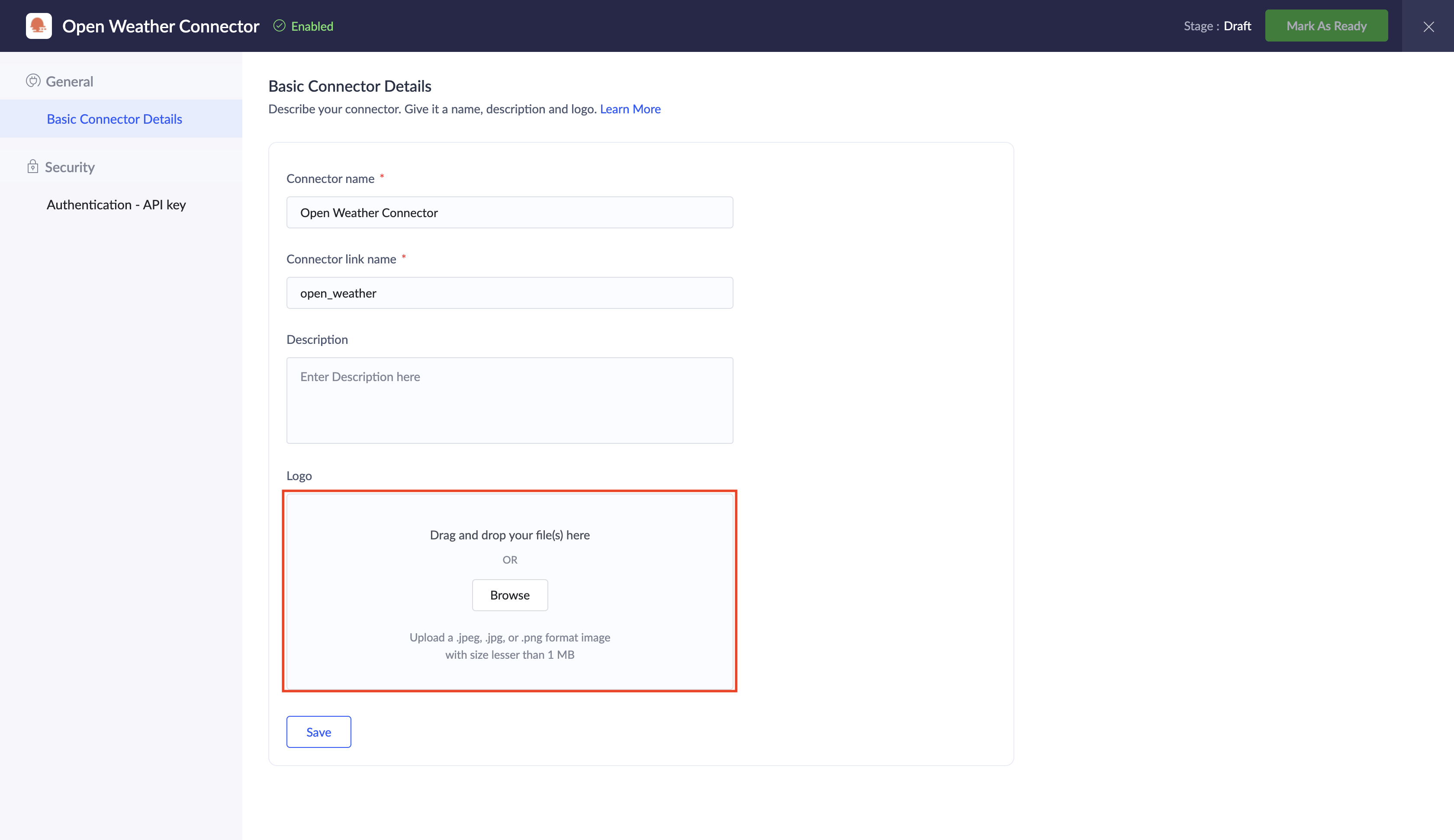 カスタムコネクター用のロゴをアップロードしてください。