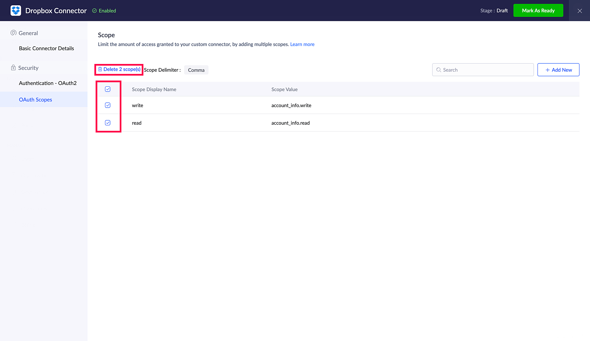複数のスコープを削除したい場合は、チェックボックスで選択し、削除をクリックします。下図を参照してください。