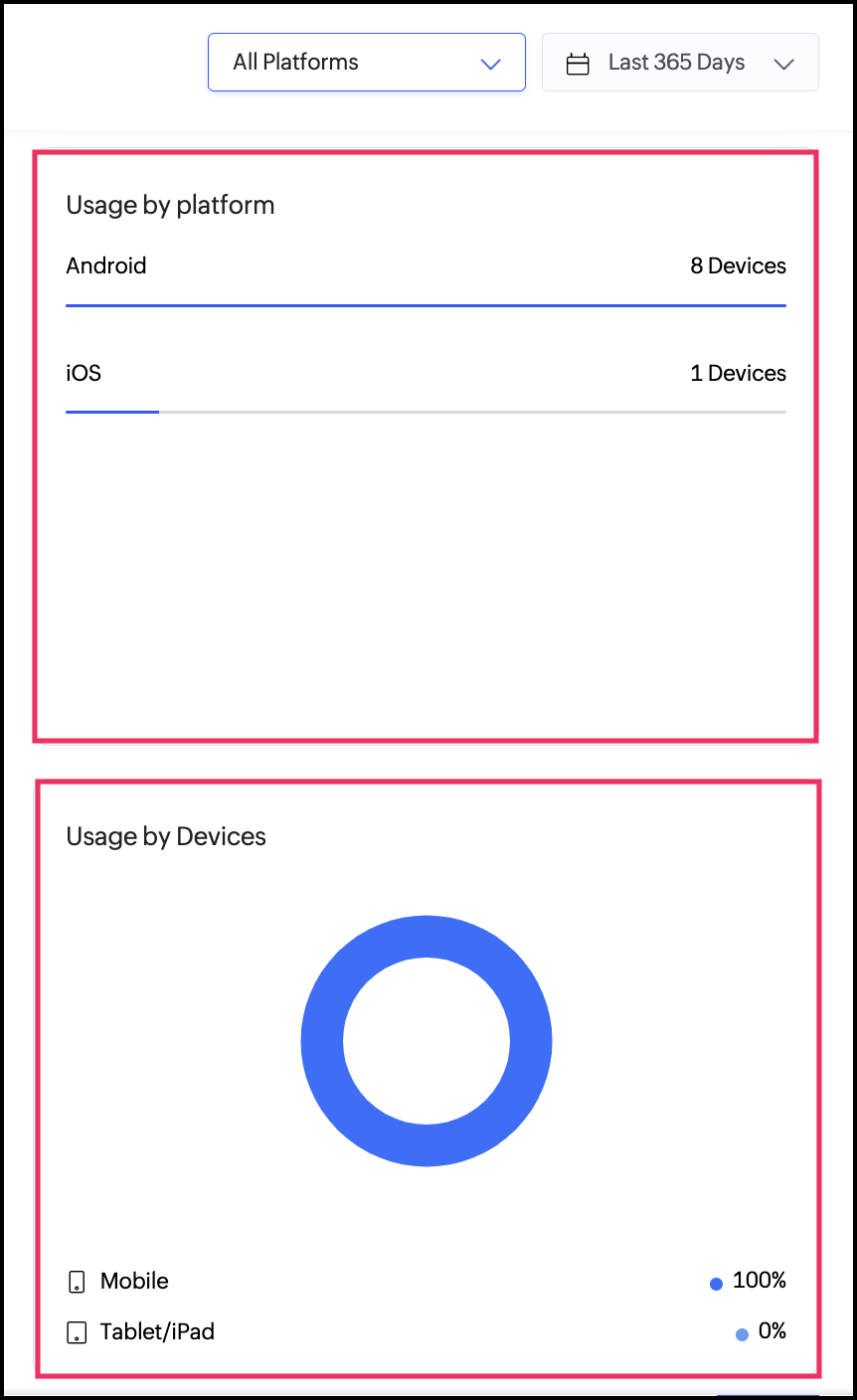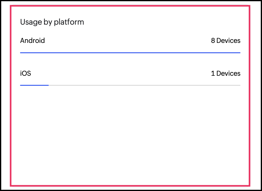 このダッシュボードでは、リブランドしたモバイルアプリへのユーザーのアクセス状況とアクティビティに基づき、選択したモバイルアプリケーションの利用統計を提供します。また、さまざまな期間にわたり、デバイスおよびプラットフォーム(iOS と Android)別のパフォーマンス指標も追跡でき、これらのインサイトを活用してアプリを最適化し、生産性を向上できます。