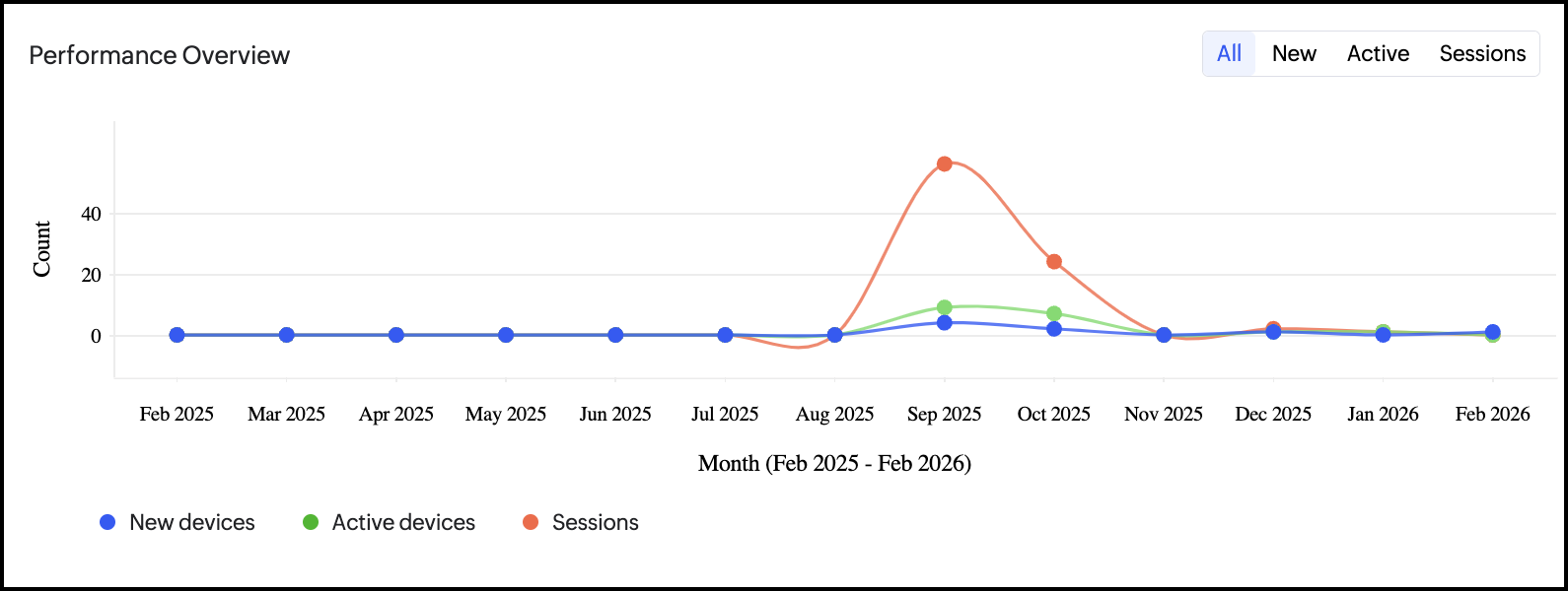 パフォーマンス概要の折れ線グラフでは、各マーカーポイントの割合(%)差分が、直前のマーカーポイントとの比較を表します。また、すべて、新規、有効、Sessions タブを切り替えて、デバイス件数(新規 または 有効)および セッション件数の推移を時系列で確認できます。