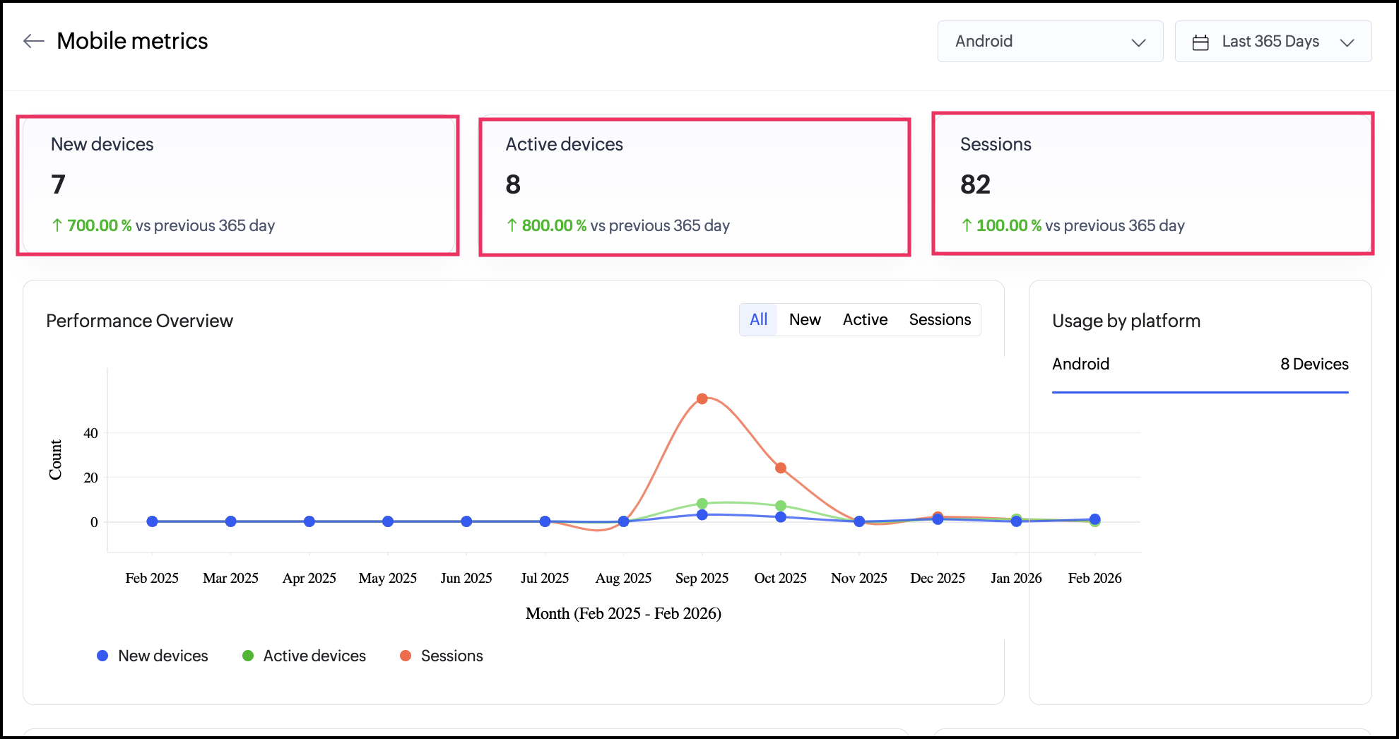 Devices(新規 と 有効)および Sessions の KPI は、モバイルアプリの導入状況とエンゲージメントを監視するために必要な利用データを取得します。これらの KPI はモバイルメトリクスダッシュボード上の概要カードとして表示され、現在の件数と前期間との比較が示されます。このビジュアル表示により、傾向の把握や利用の急増・急減の特定、直近のアプリ更新の影響評価をすばやく行えます。