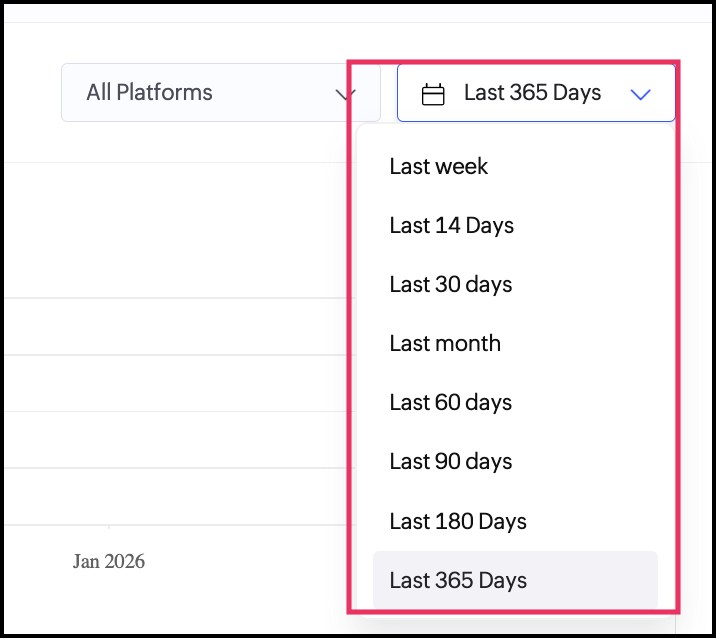 日付フィルターを使用すると、分析対象の期間を変更できます。選択した期間に基づき、両方のチャートが自動的に更新され、エンゲージメントトレンドをより深く分析できます。このフィルターを使用して次のことができます。