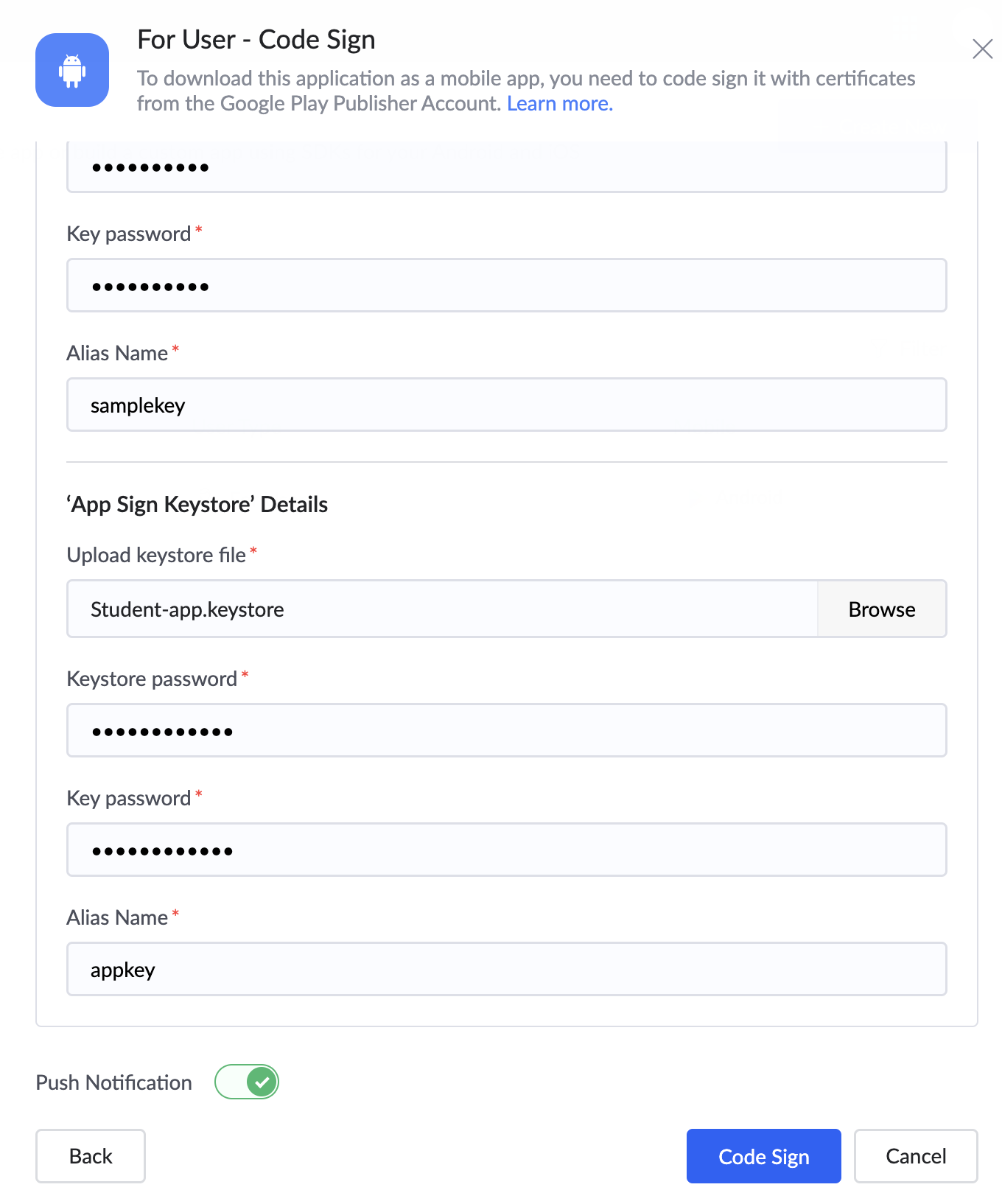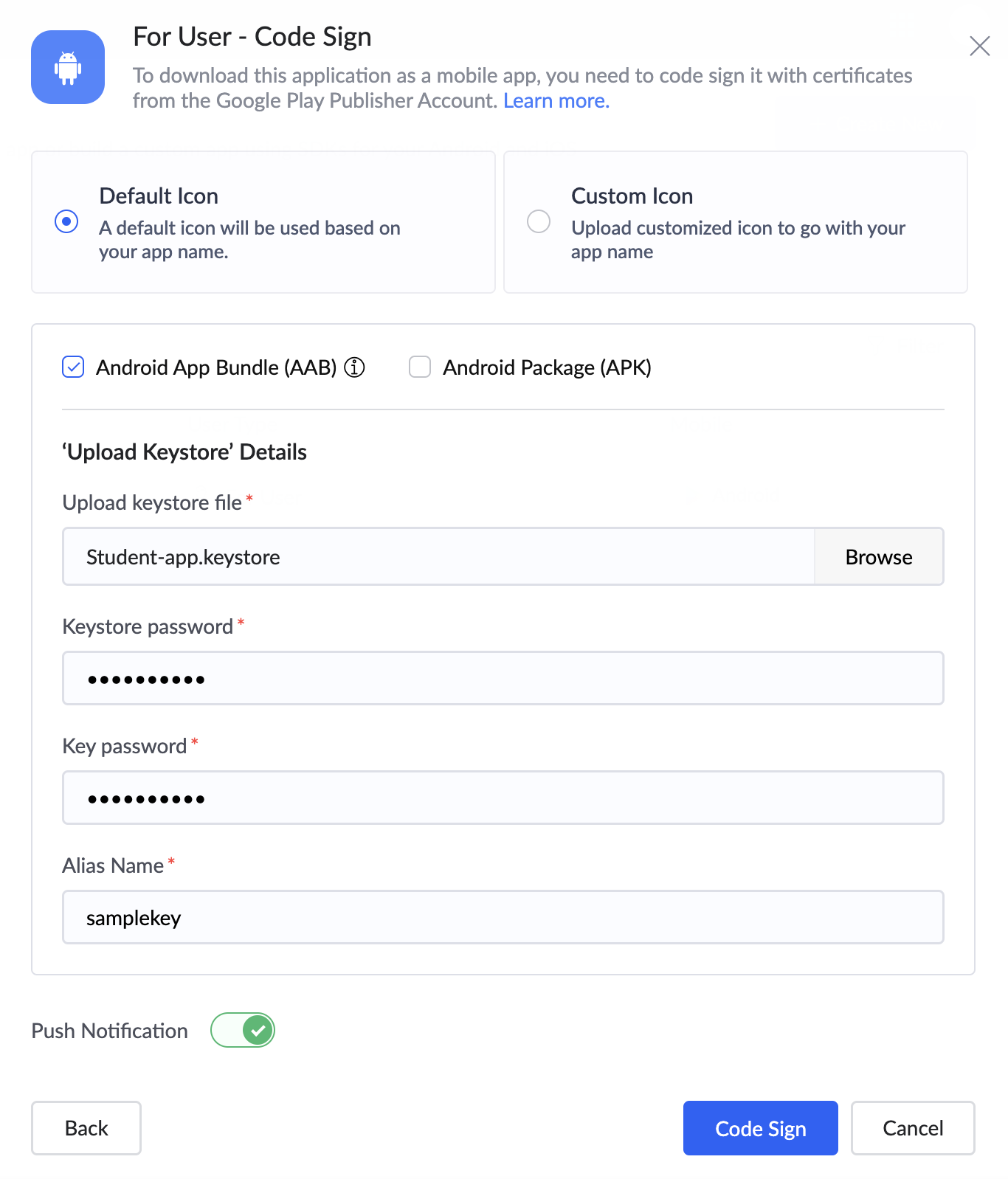 AABが作成されたら、App Signing keystoreの詳細を使用して簡単にAPKを生成できます。