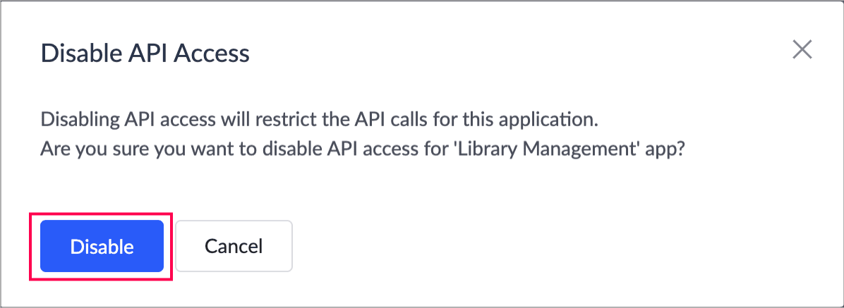 有効 ボタンを切り替えると、API アクセスを無効にする ポップアップが表示されます。無効にするをクリックします。