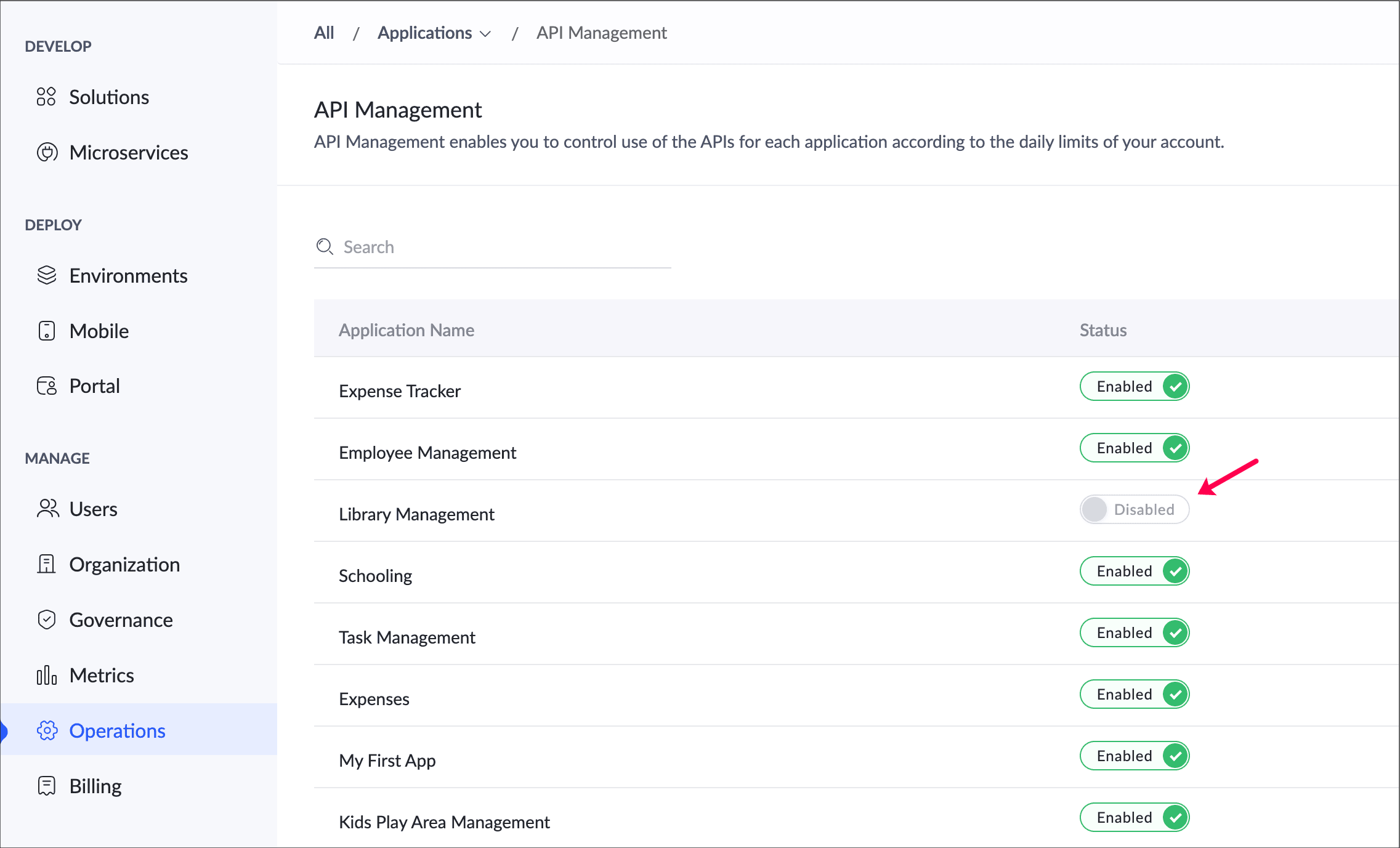 左側ペインのOperations に移動し、アプリケーション 配下のAPI Management をクリックします。