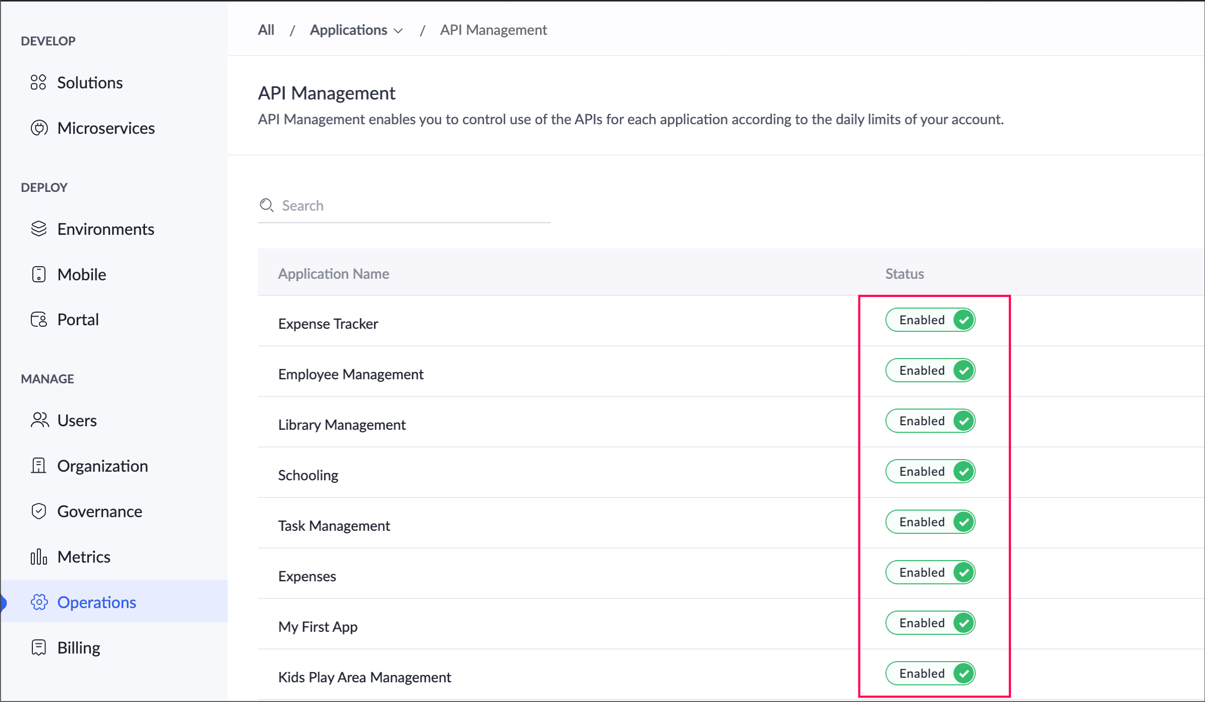 API Managementページに、すべてのアプリケーションの一覧が表示されます。