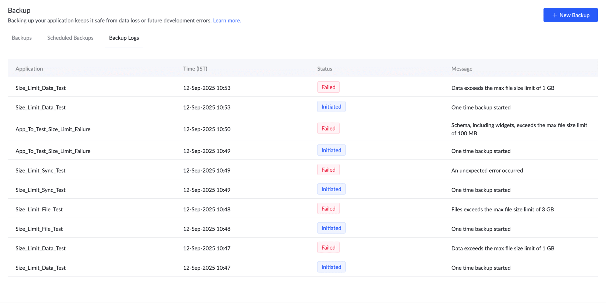 - バックアップログ:各バックアップの詳細なログが表示され、ステータス(完了または失敗)や監査・トラブルシューティングに必要な情報がすべて確認できます。