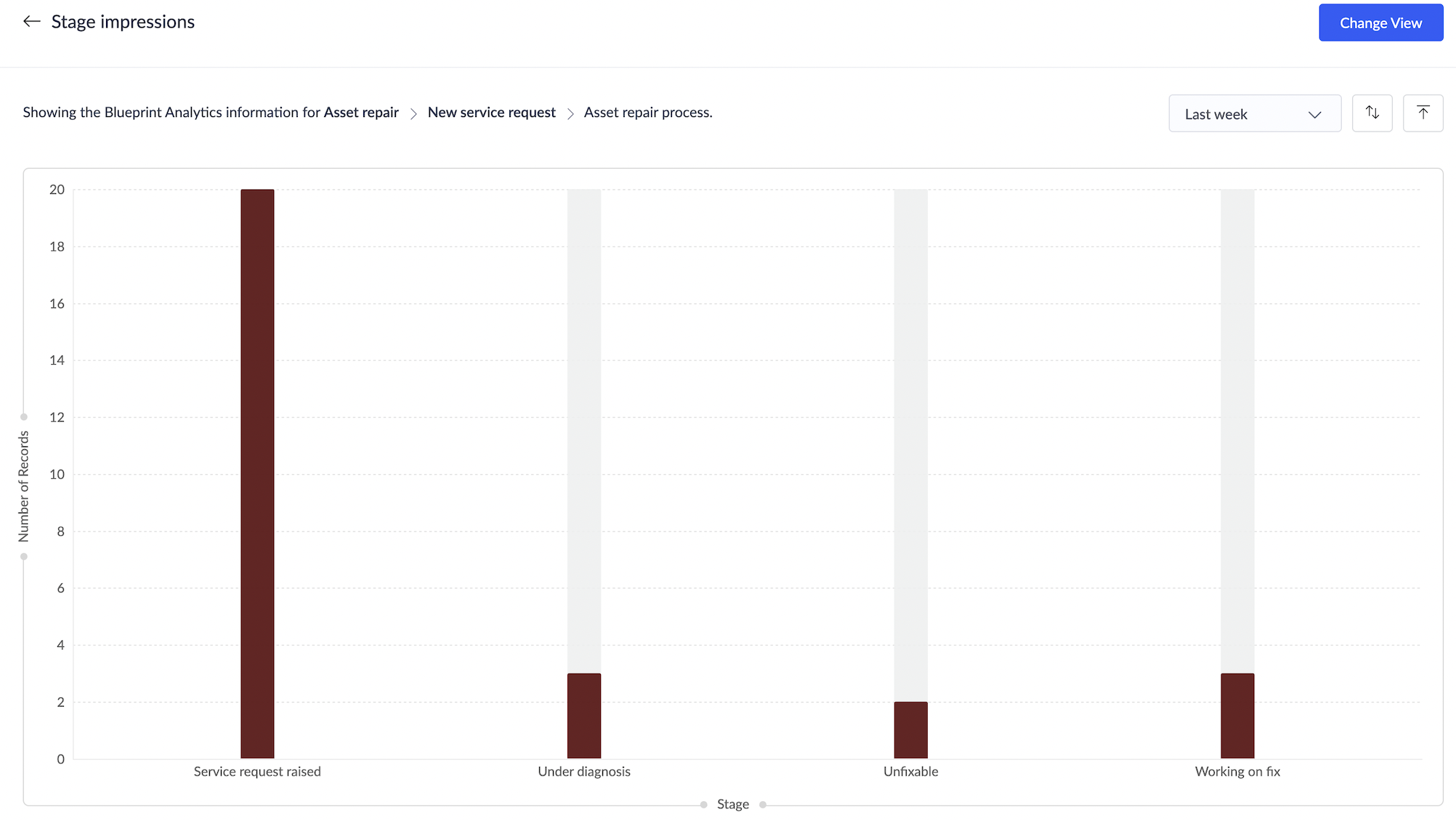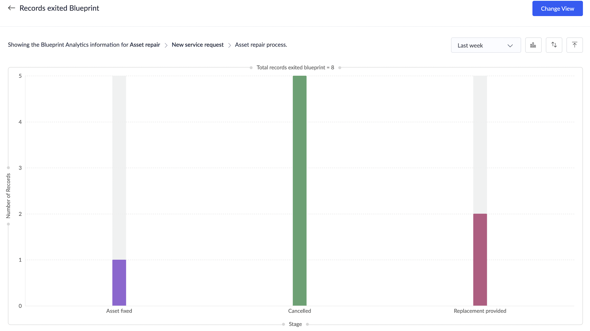 このグラフでは、ブループリントの各ステージを経て終了したデータの内訳を確認できます。組織はプロセス内での解決傾向を把握するために活用できます。