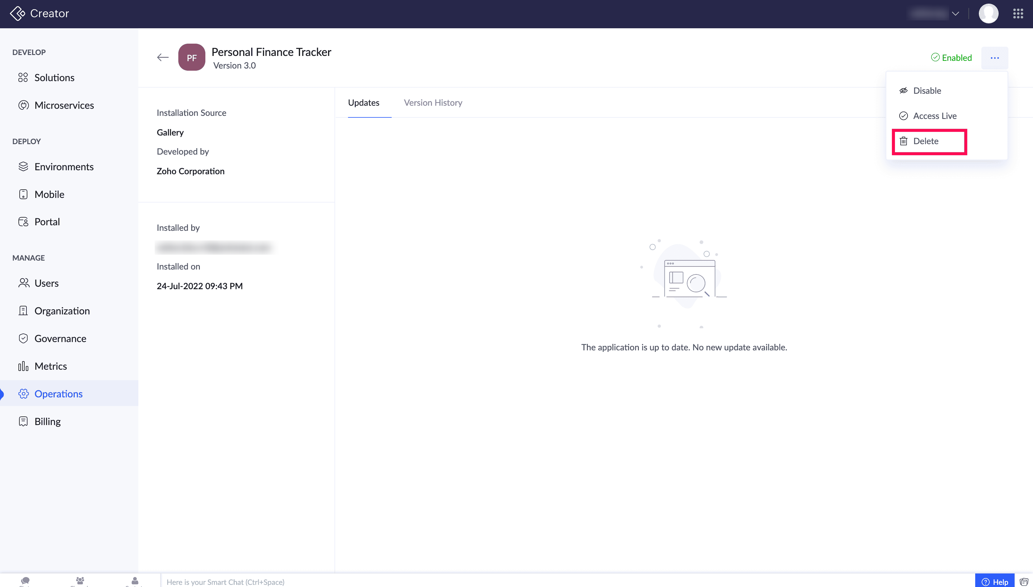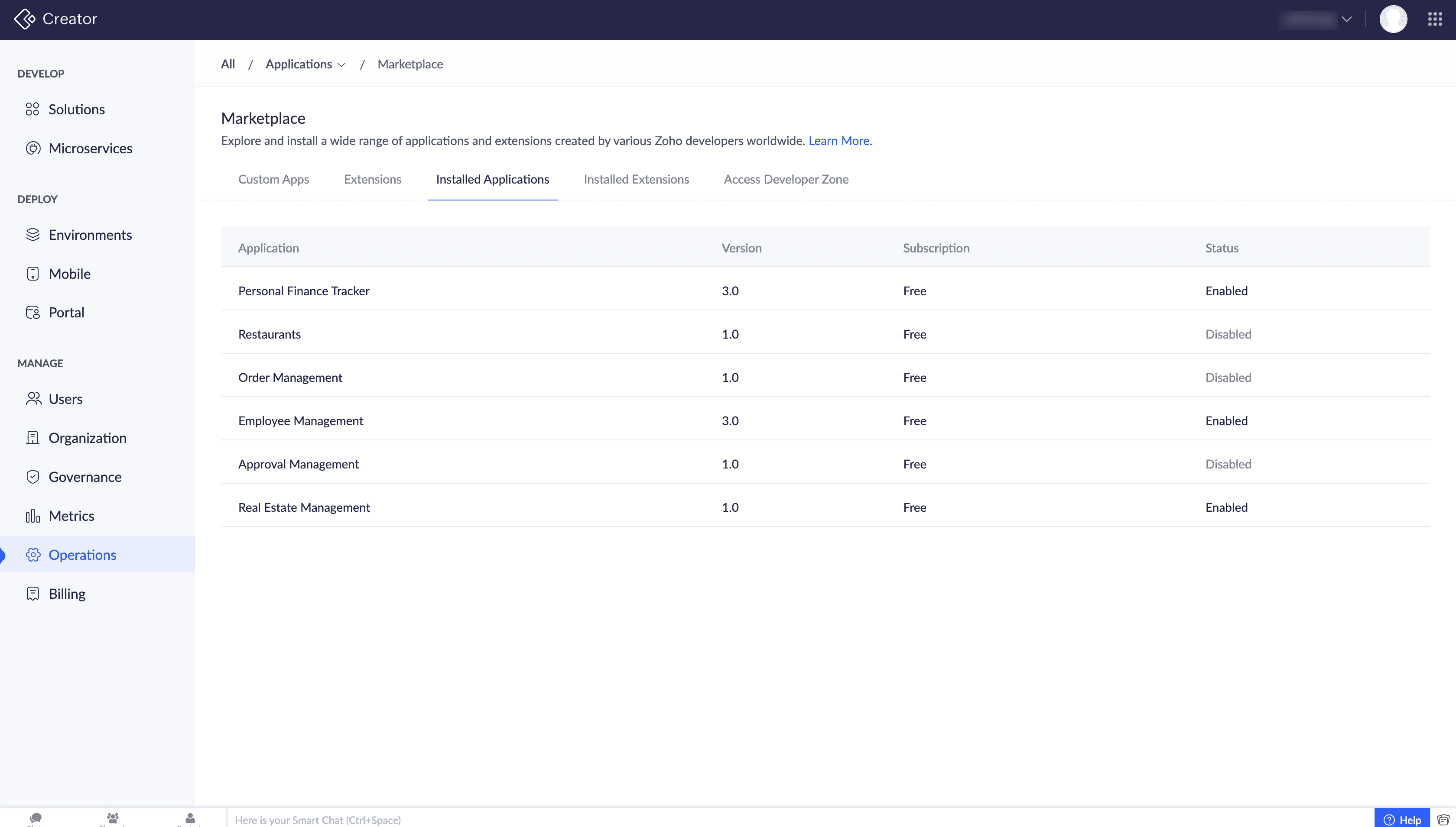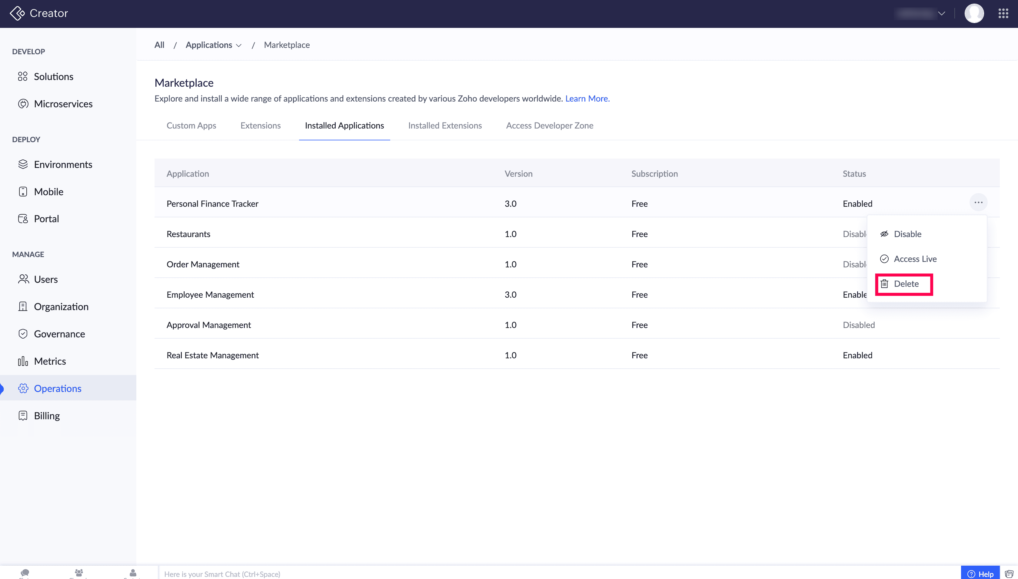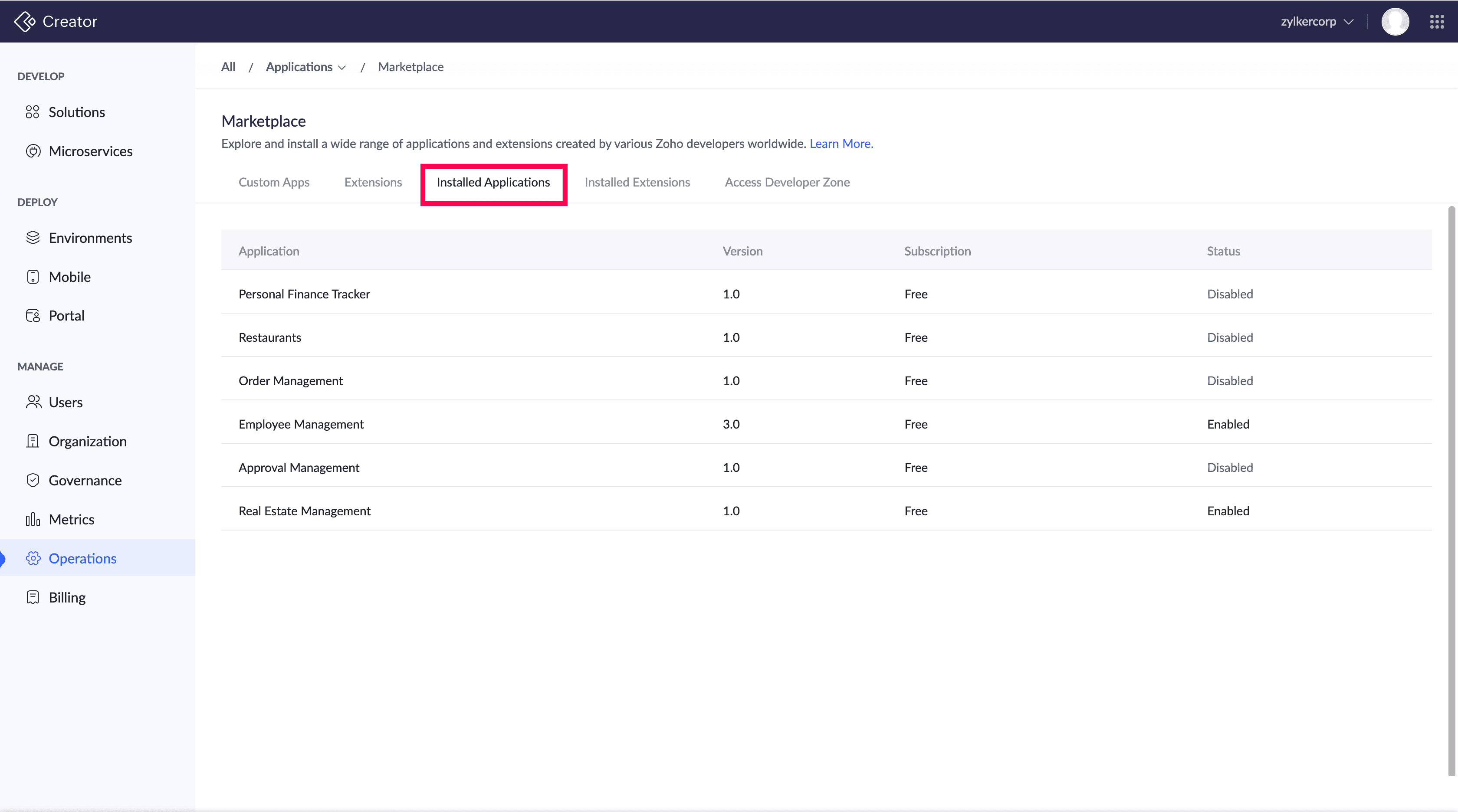 Operations > マーケットプレイス > Installed アプリケーション に移動します。