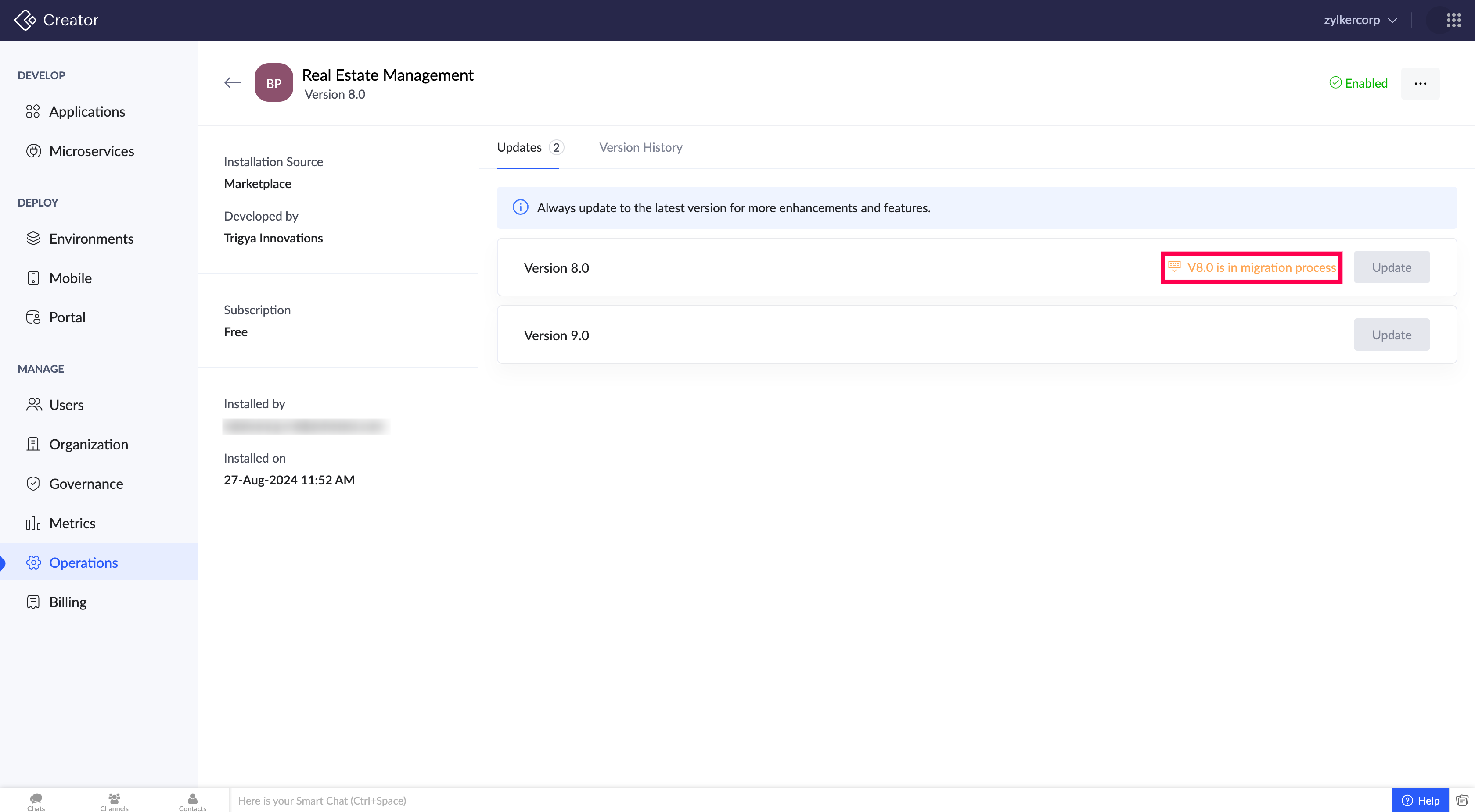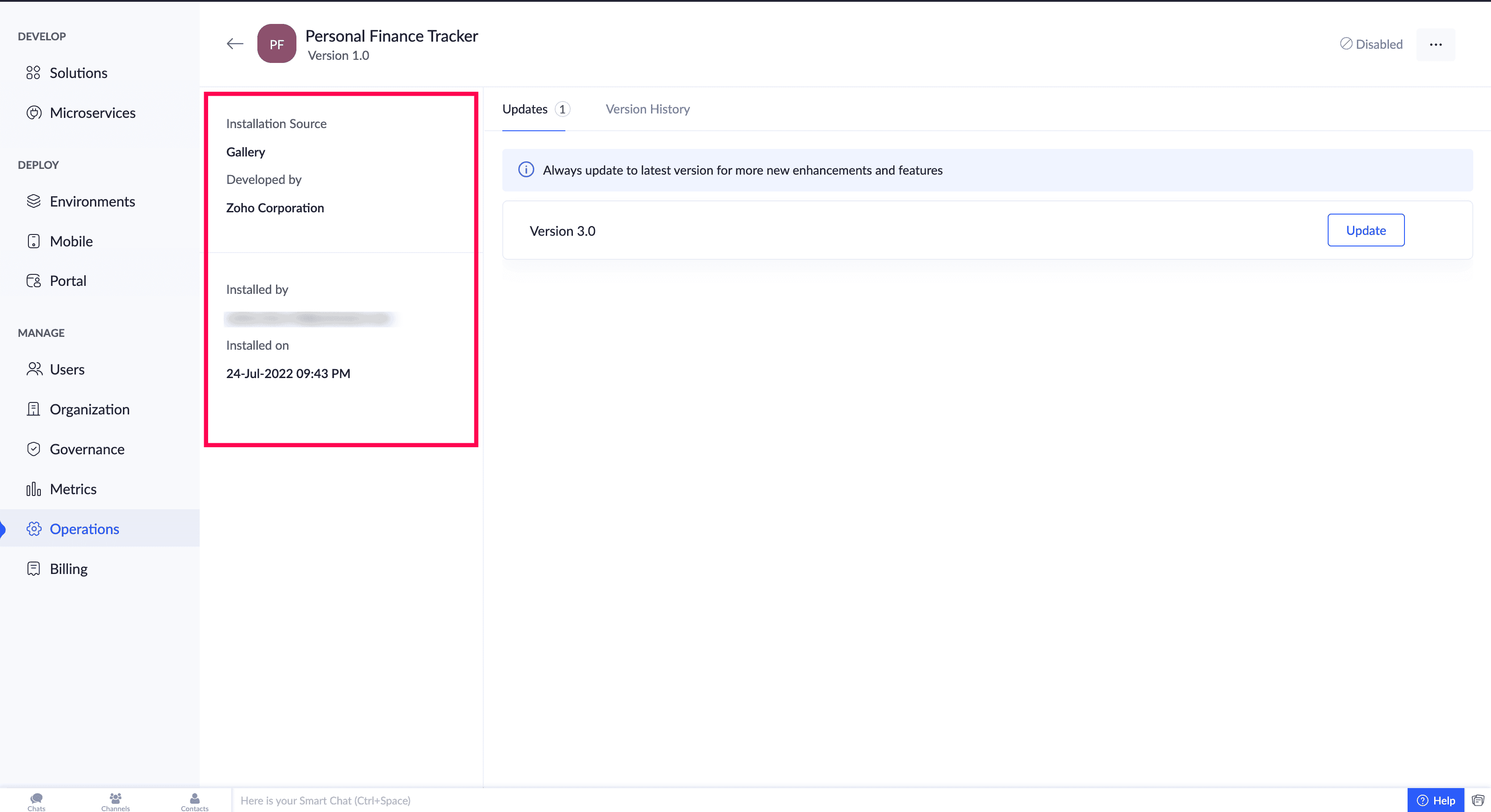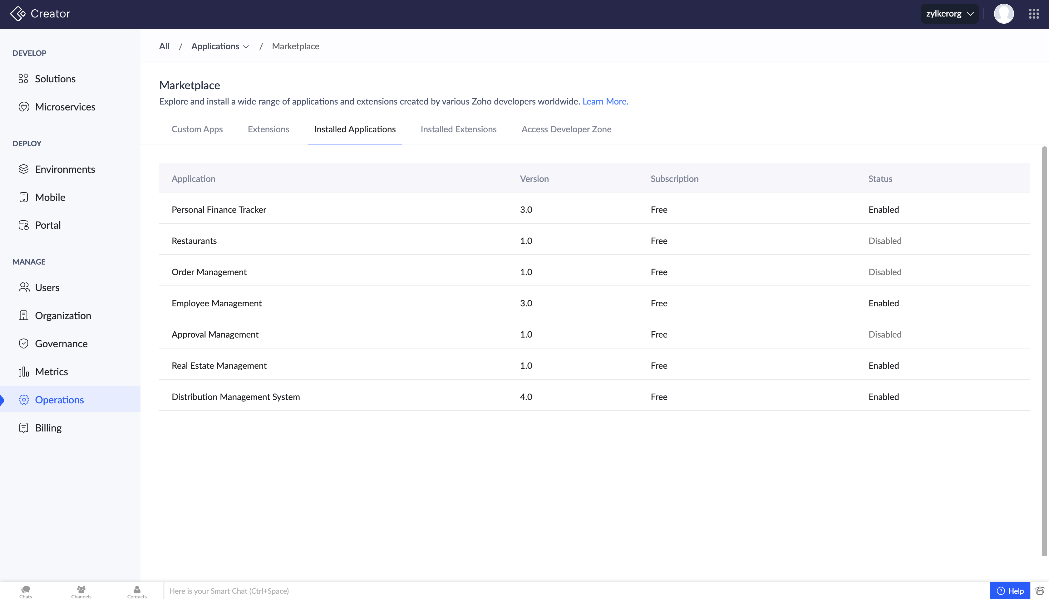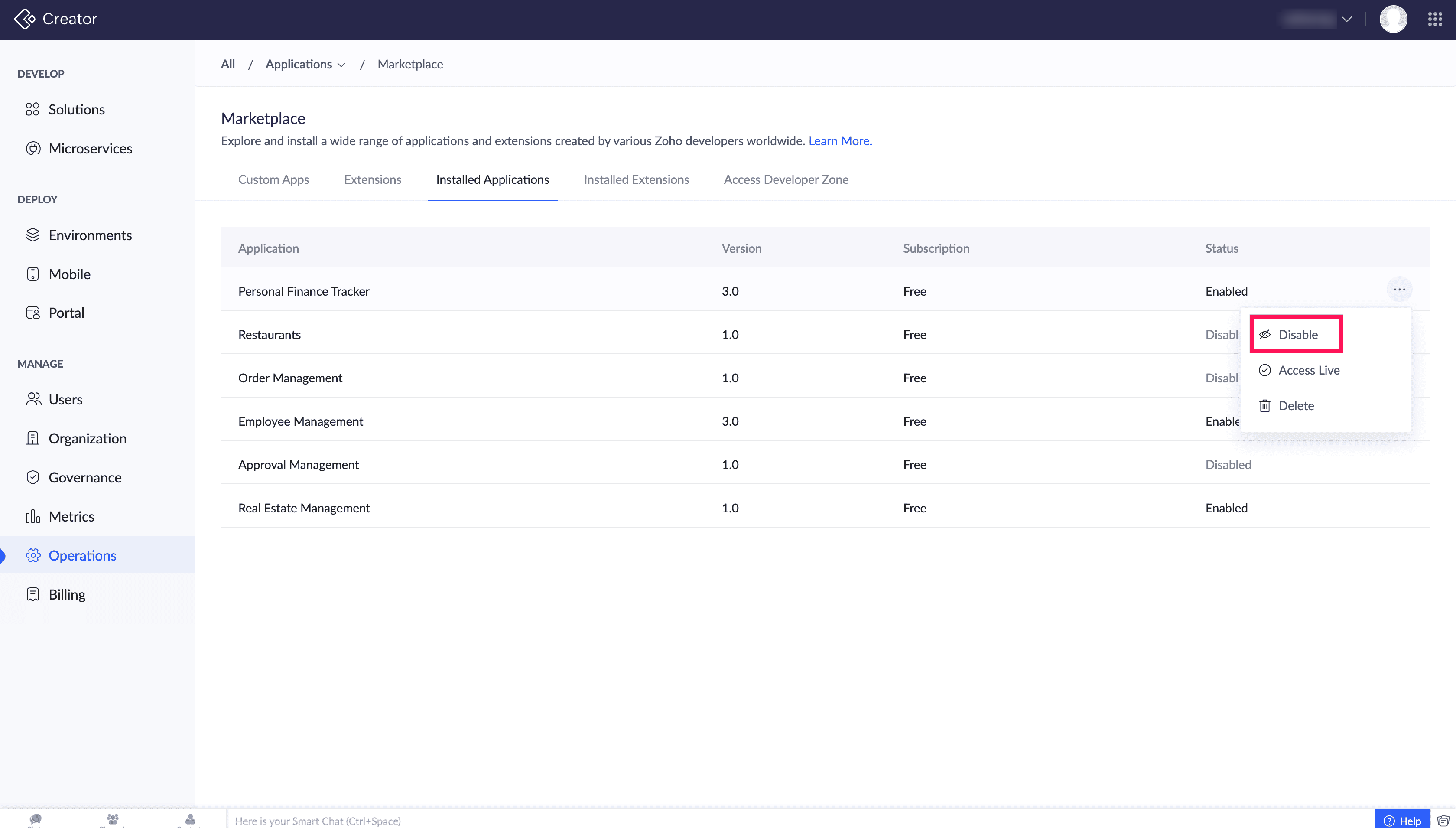 Operations > マーケットプレイス > Installed アプリケーション に移動します。