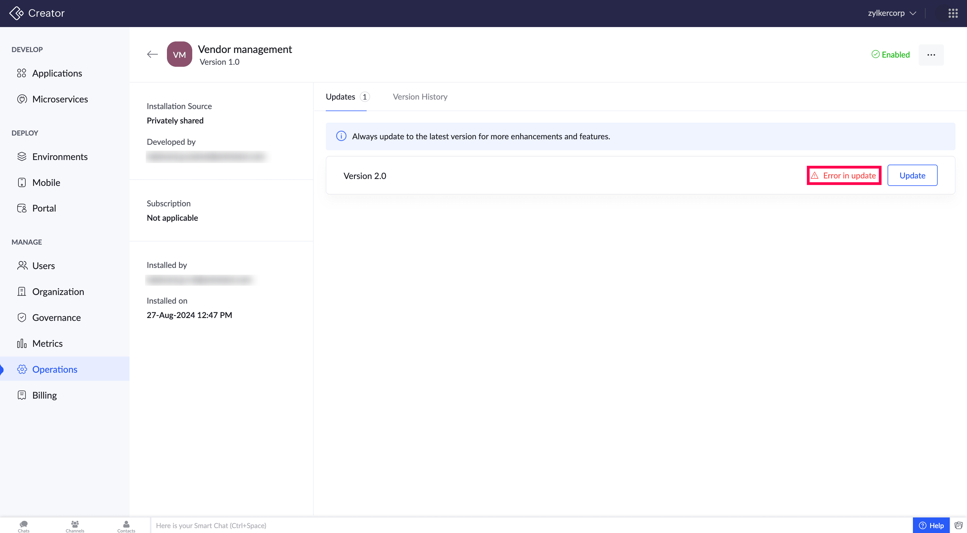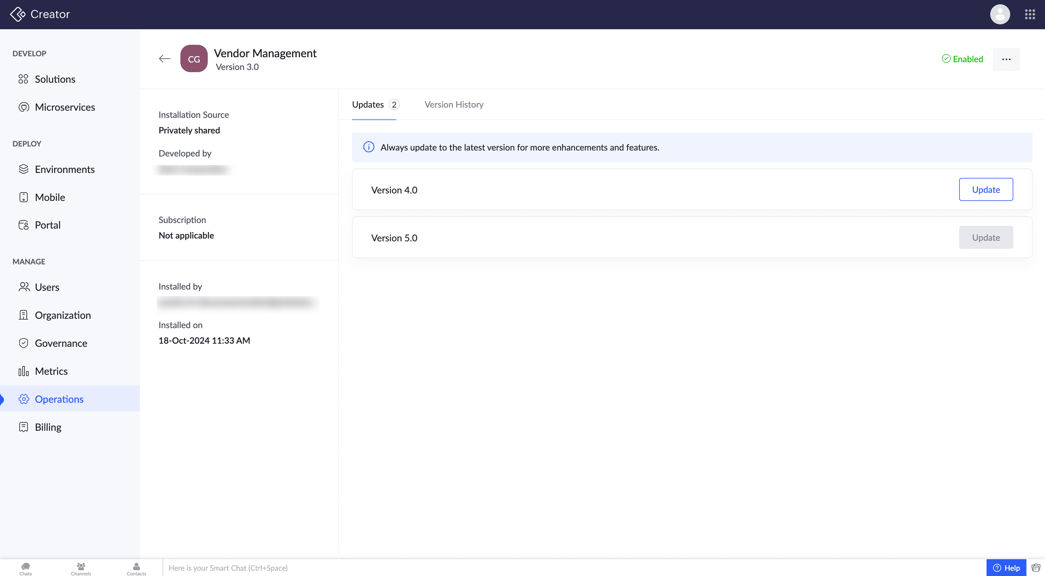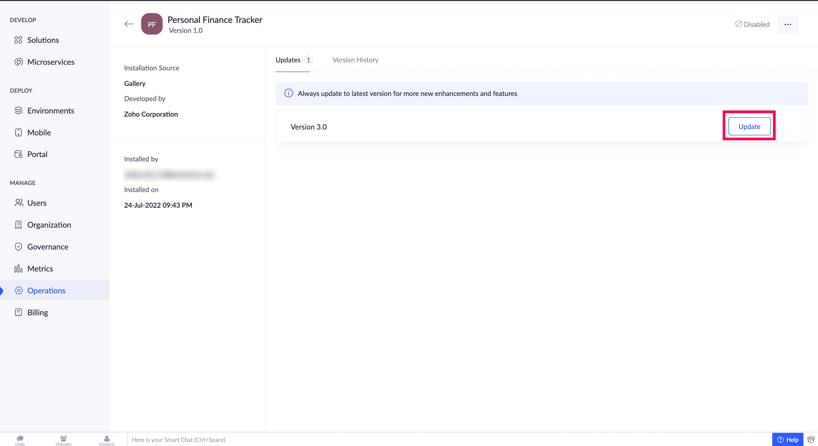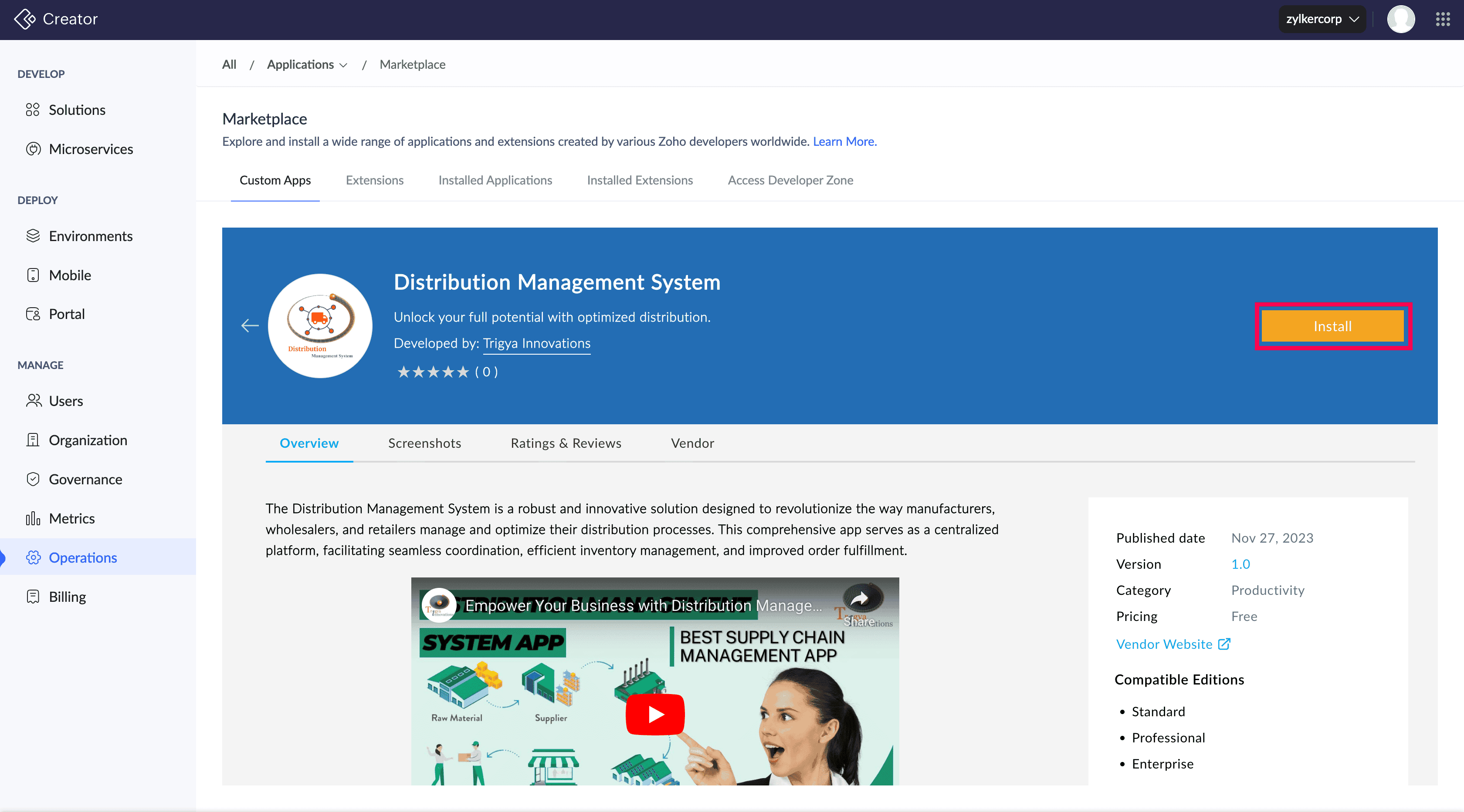 Operations > マーケットプレイス > Installed アプリケーション に移動します。