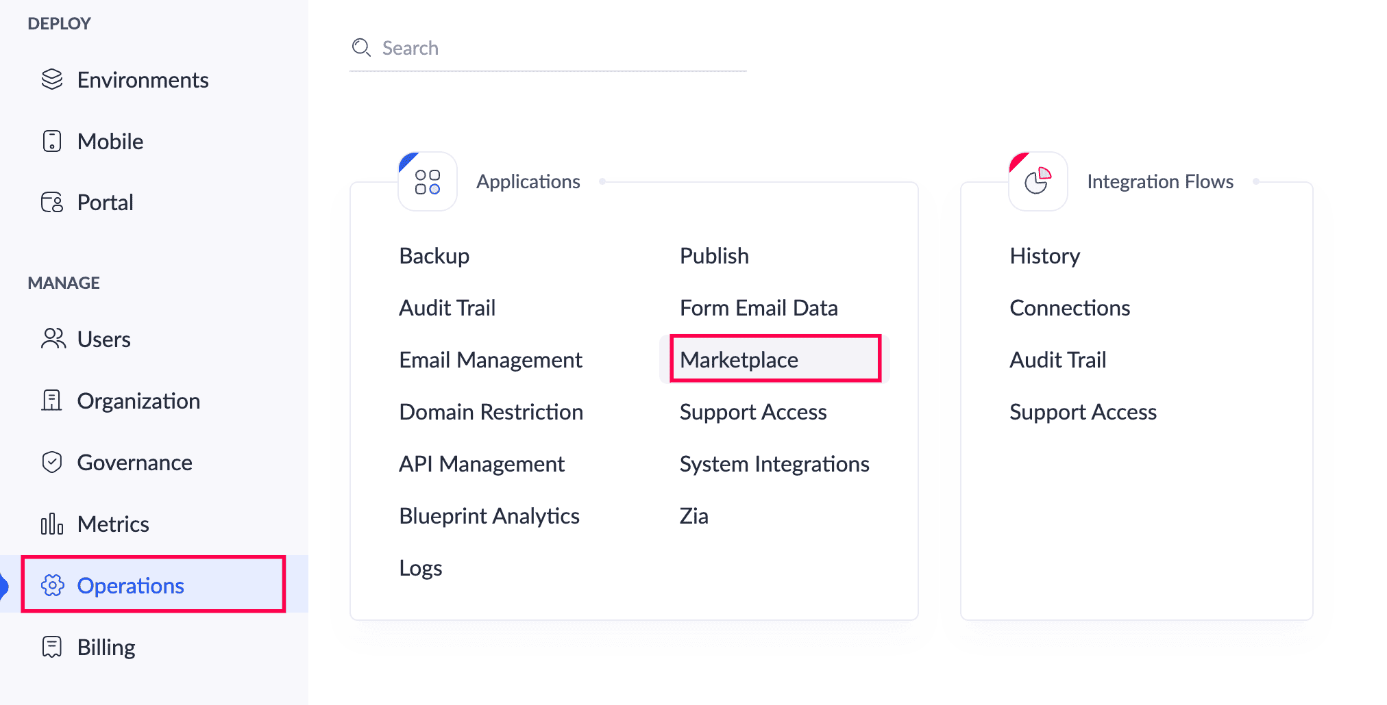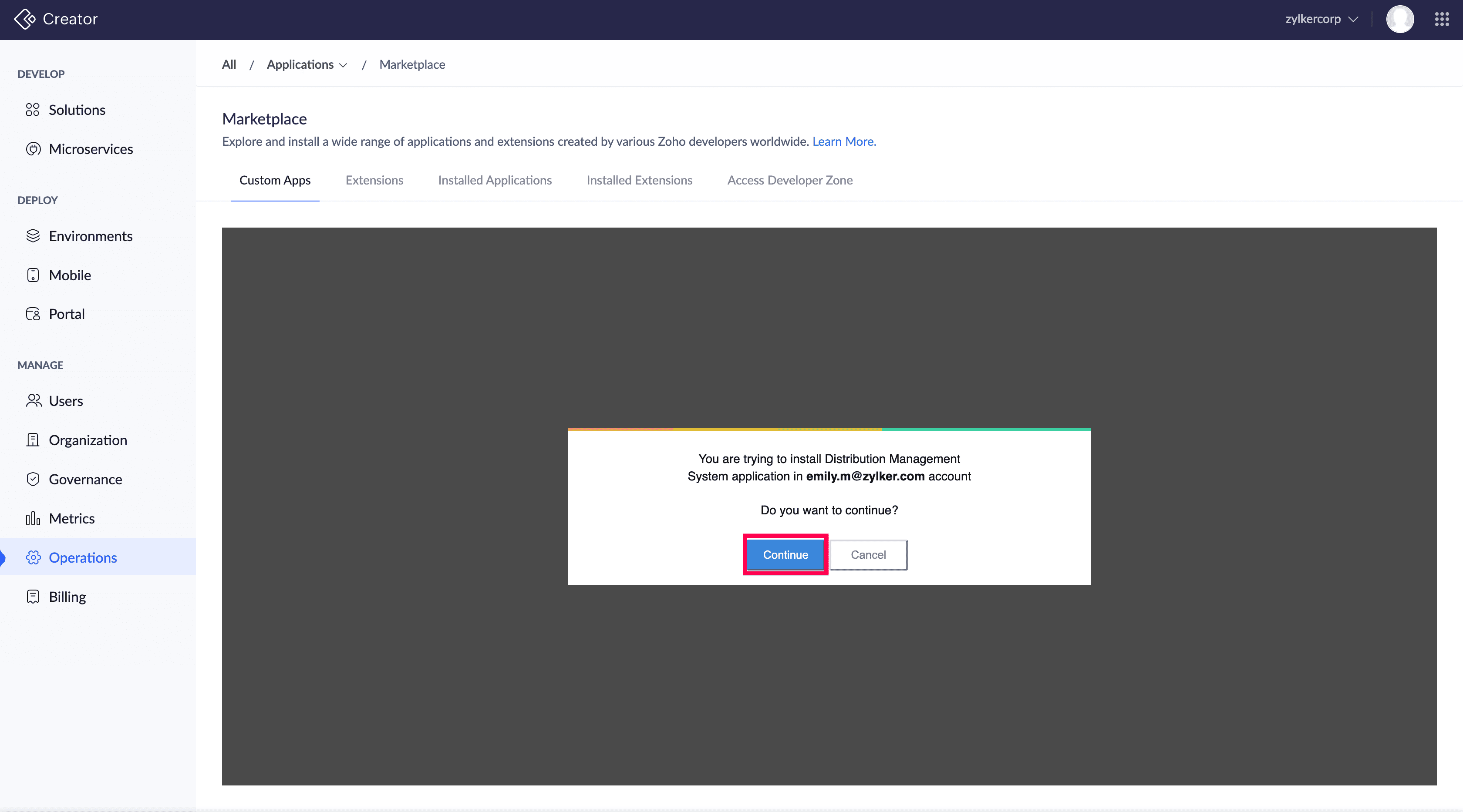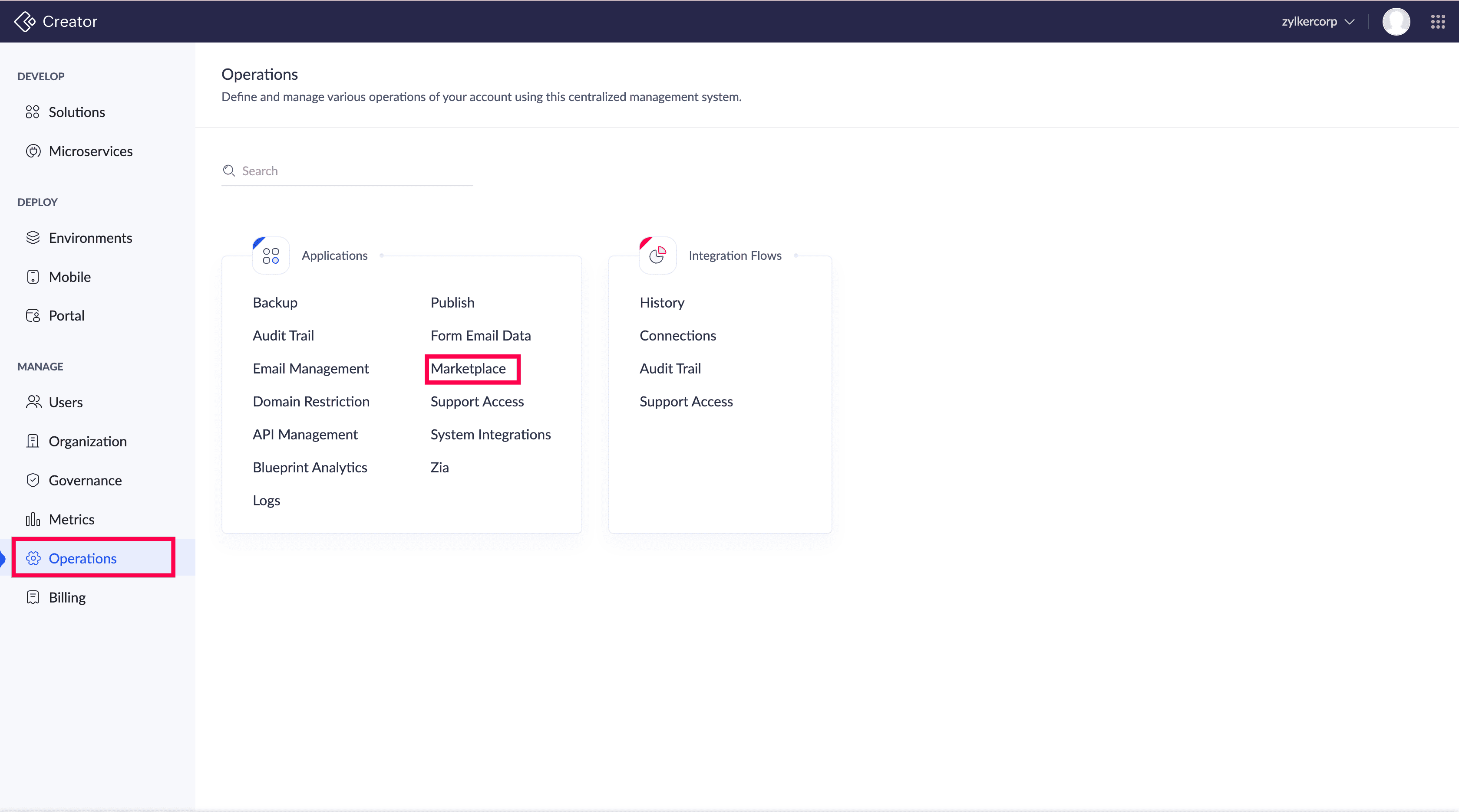CreatorアカウントでOperations > マーケットプレイスに移動します。