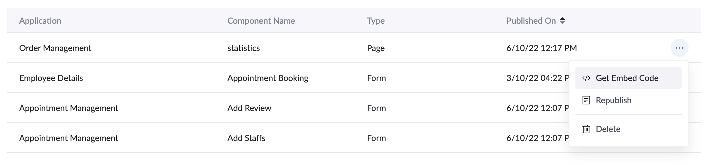 4. コンポーネントに必要な埋め込みコードを取得するには、横の省略記号 ( 三つの点 ) に隣接しているコンポーネントをクリックして、埋め込みコードを取得.