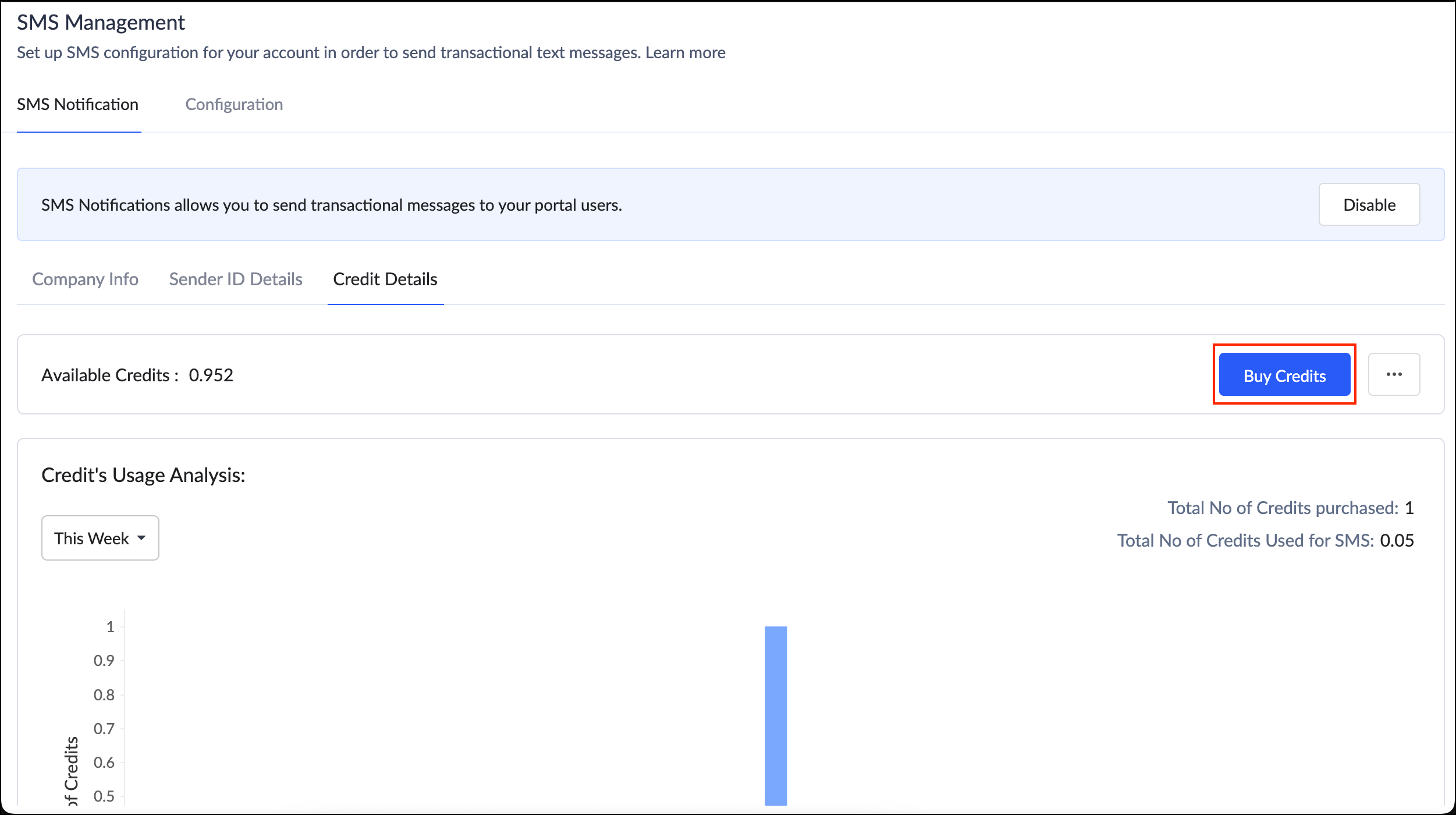 SMS通知を送信するには、Zoho Creatorアカウントにクレジットの残高を維持する必要があります。SMSメッセージがあなたのアカウントから送信されるたびに、これらのクレジットが引き落とされます。企業情報と送信者IDの詳細を更新したら、 クレジットの詳細 タブに進みます。ここでは、利用可能な残高を確認し、クレジットの使用状況をレビューし、新しいクレジットを購入し、自動充電設定を行い、クレジットの購入履歴を見ることができます。