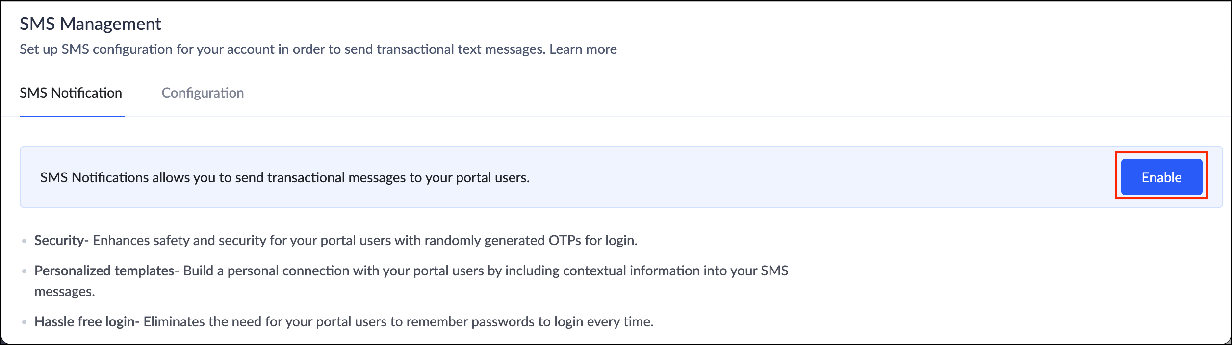 最後に、このセクションの必要なポータルにこれらのSMSテンプレートをデプロイします。ここで、ドロップダウンメニューからポータルの送信者を選択し、ポータルを有効にするをクリックします。