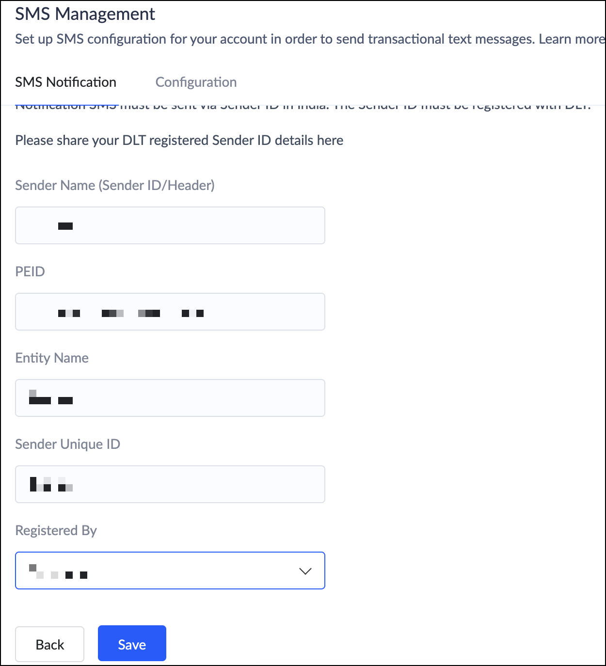 送信者名 (送信者ID/ヘッダー): DLTに登録された一意のアルファヘッダー、TRAIの規制に基づいてトランザクション通信を送信するためのものです。