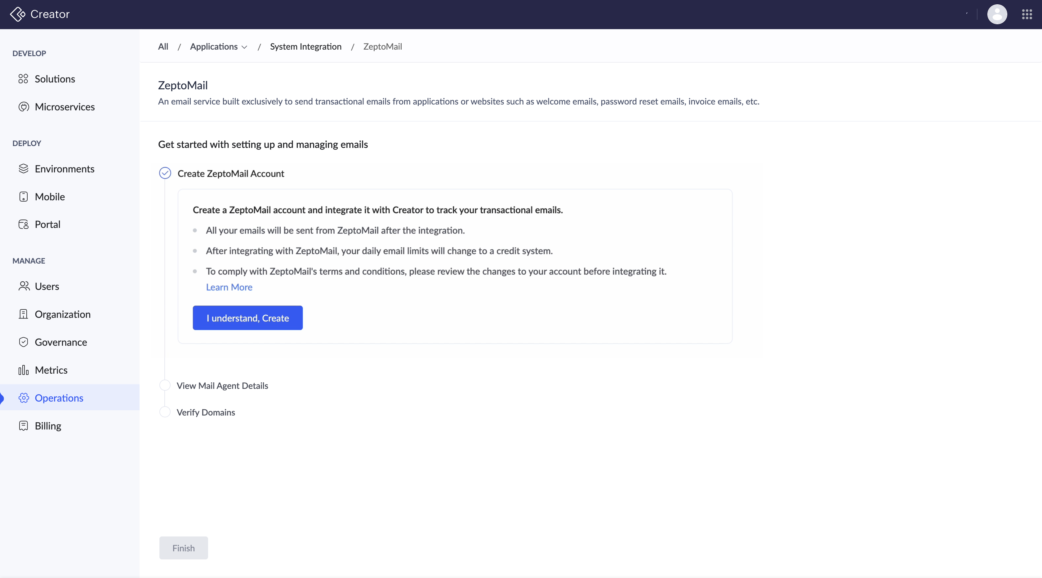 アカウント作成:了解しました, 作成をクリックして新しい ZeptoMail アカウントを作成し、Creator アカウントと連携します。まだ ZeptoMail ユーザーでない場合、新規アカウントが作成され、自動的に連携されます。