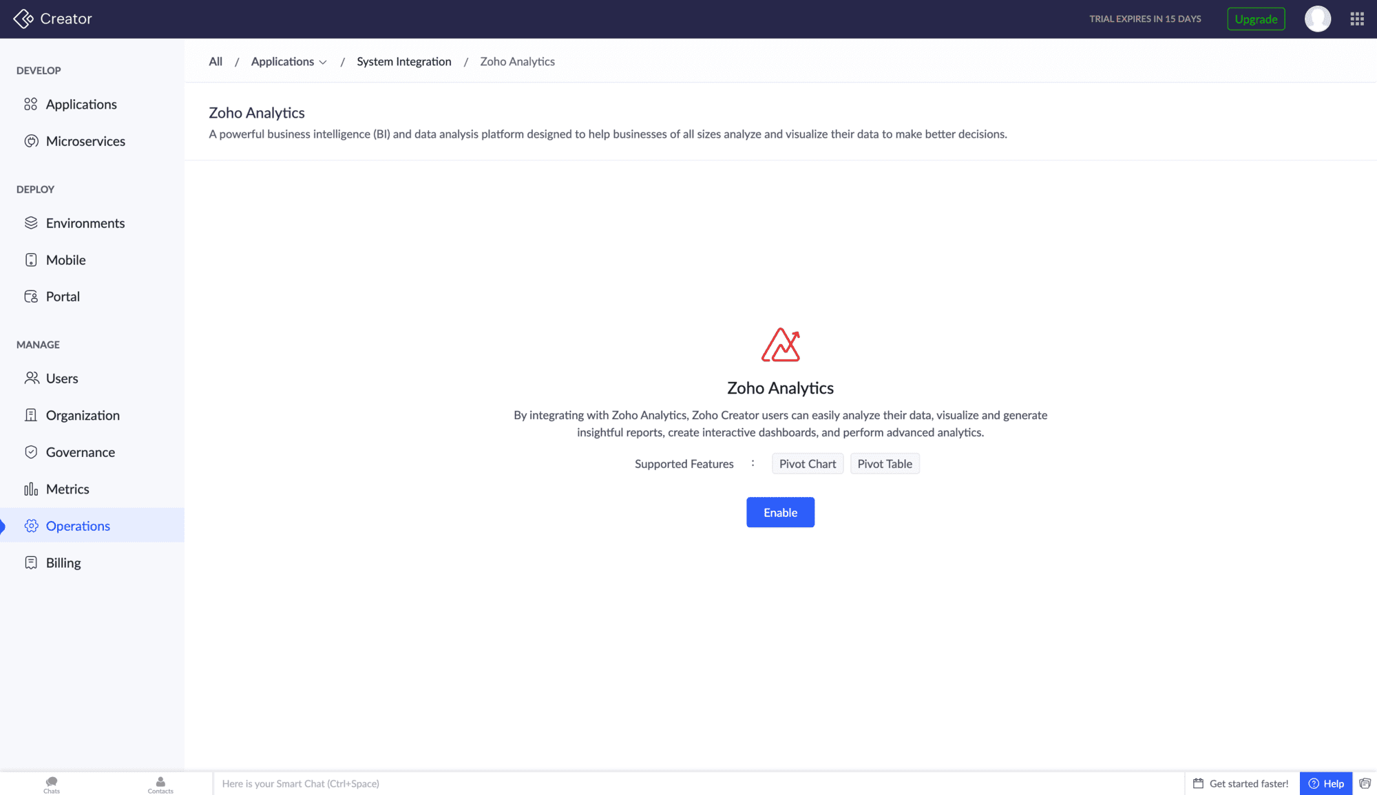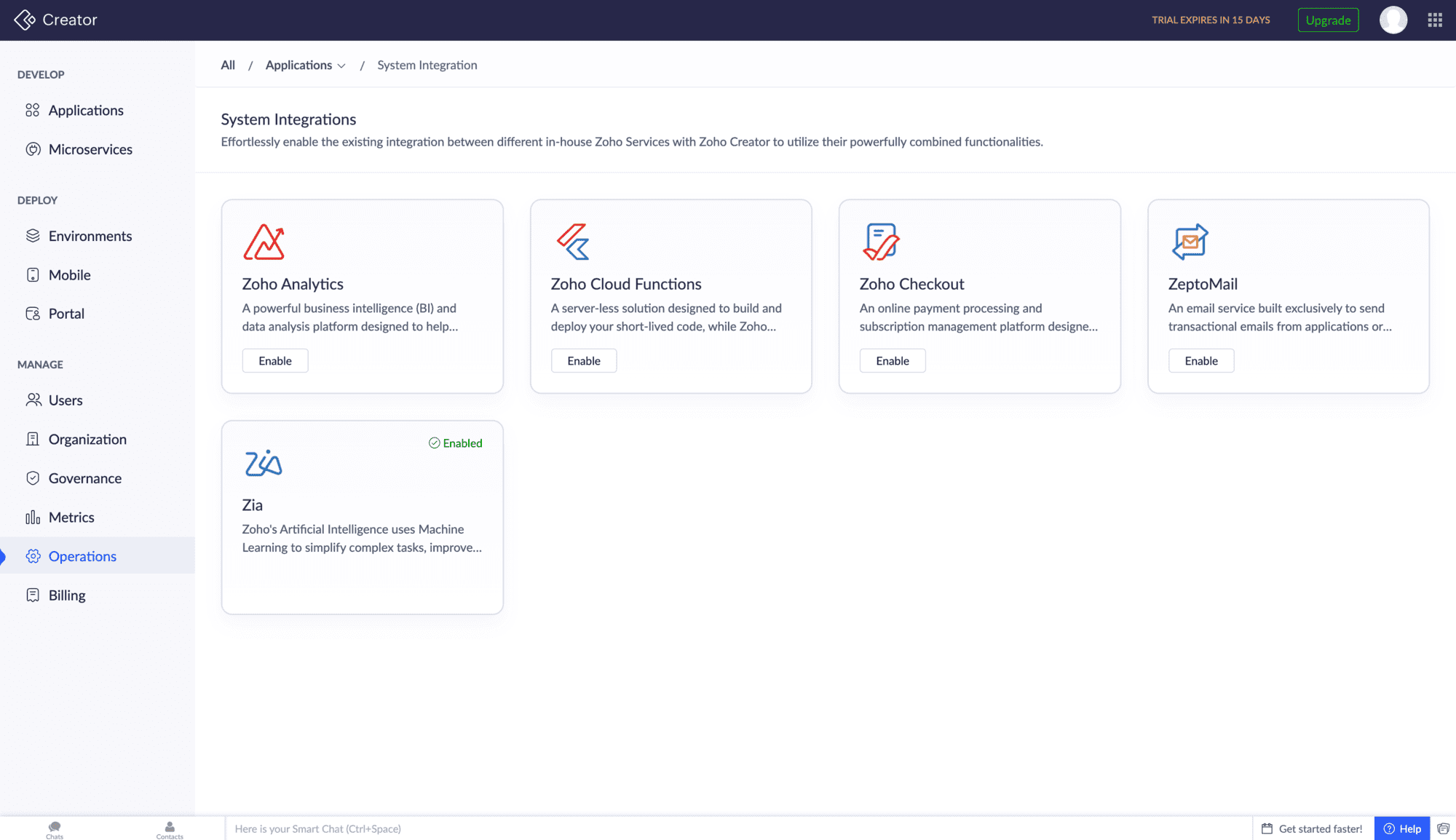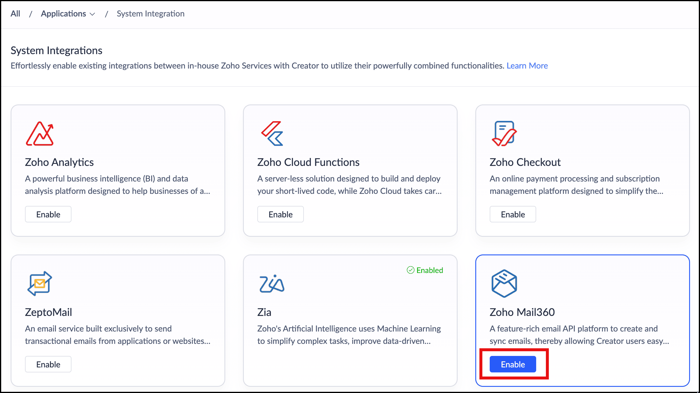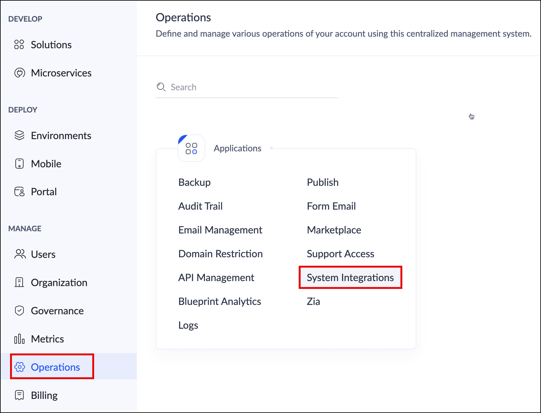管理のOperationsに移動し、System Integrationsをクリックします。System Integration サービスの一覧が表示されます。ZeptoMail カード上の有効にするボタンをクリックしてください。