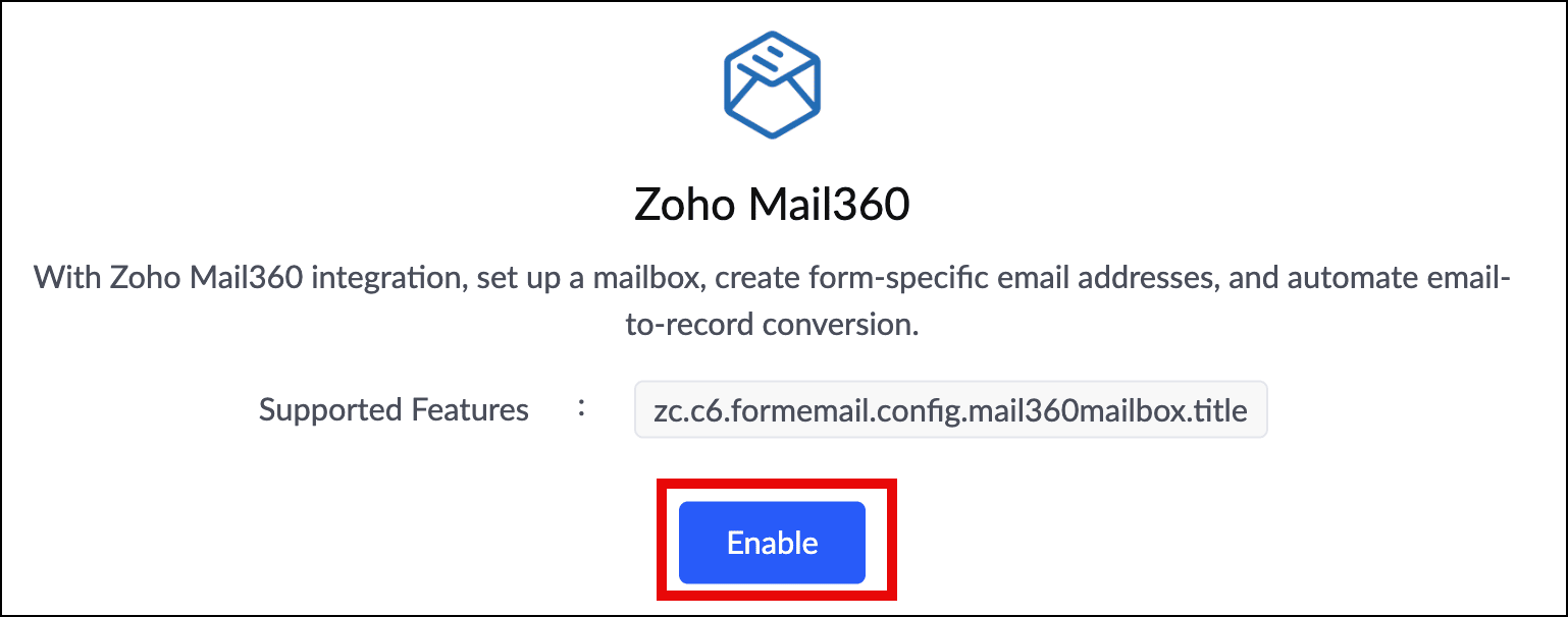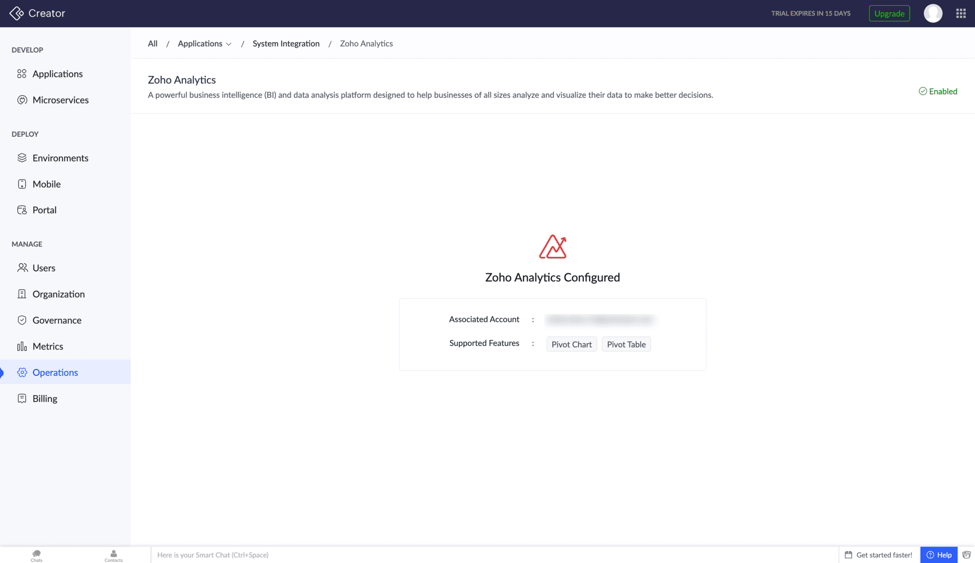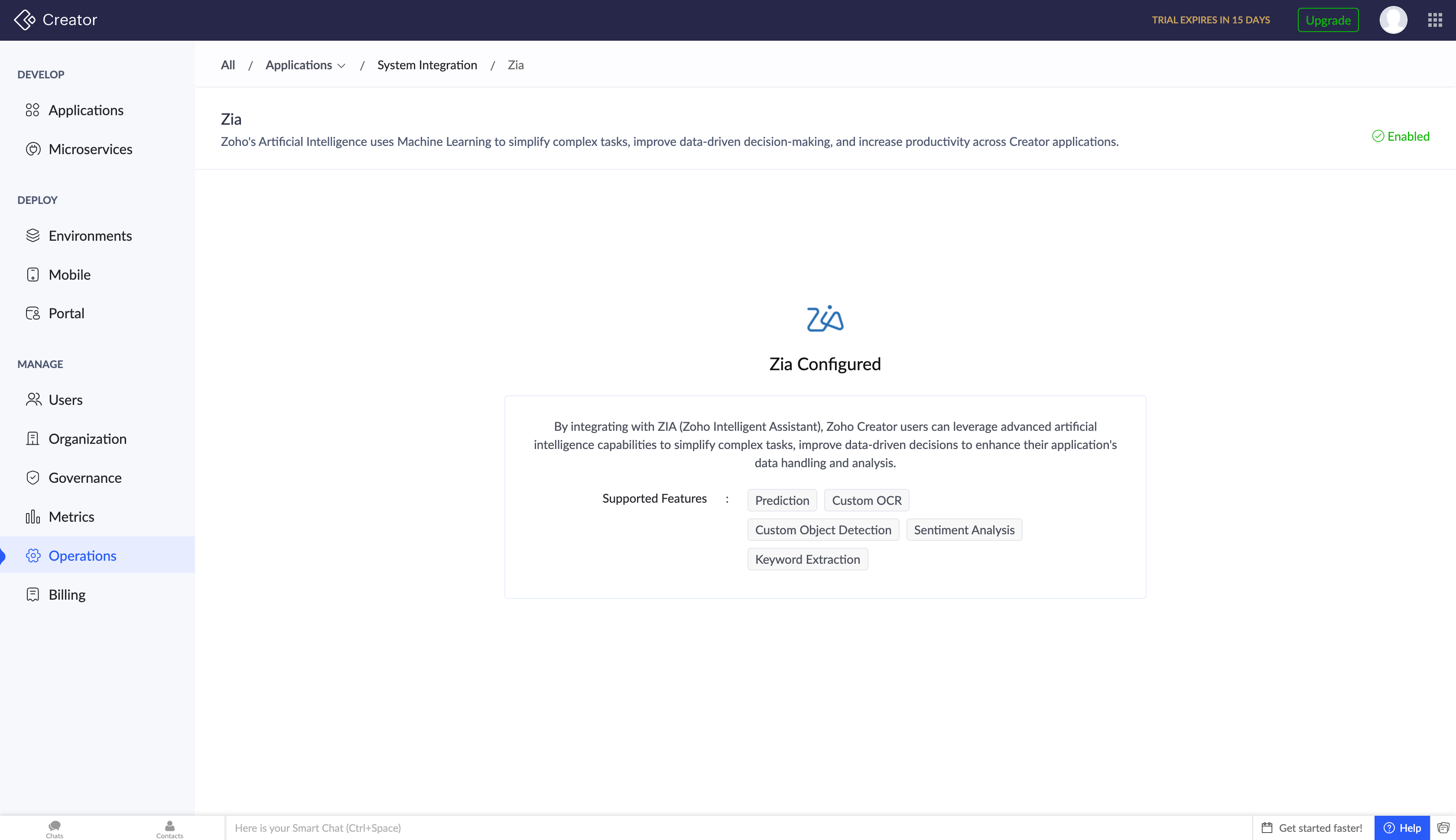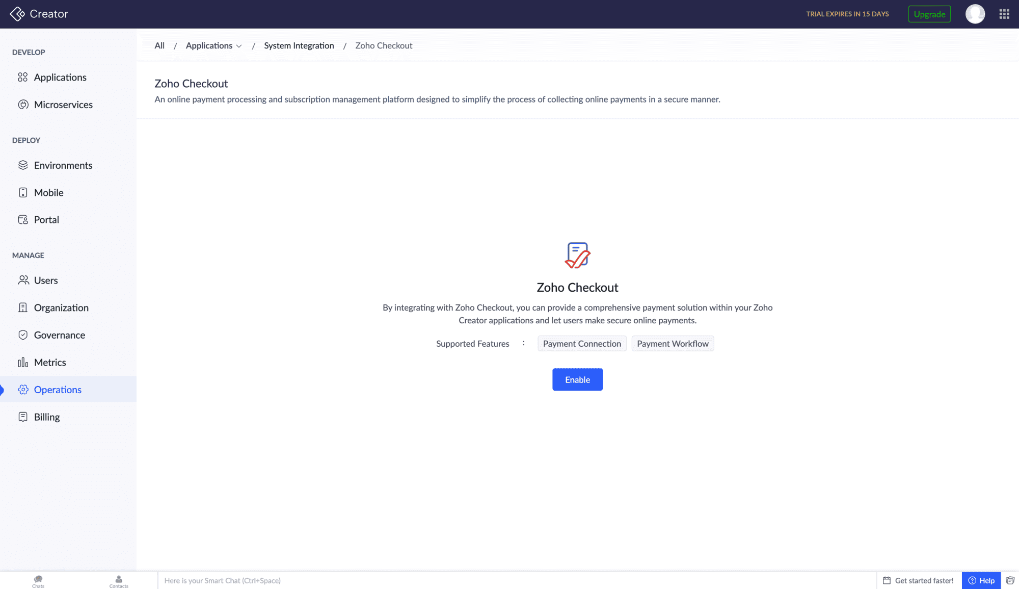 管理のOperationsに移動し、System Integrationsをクリックします。System Integration サービスの一覧が表示されます。ZeptoMail カード上の有効にするボタンをクリックしてください。