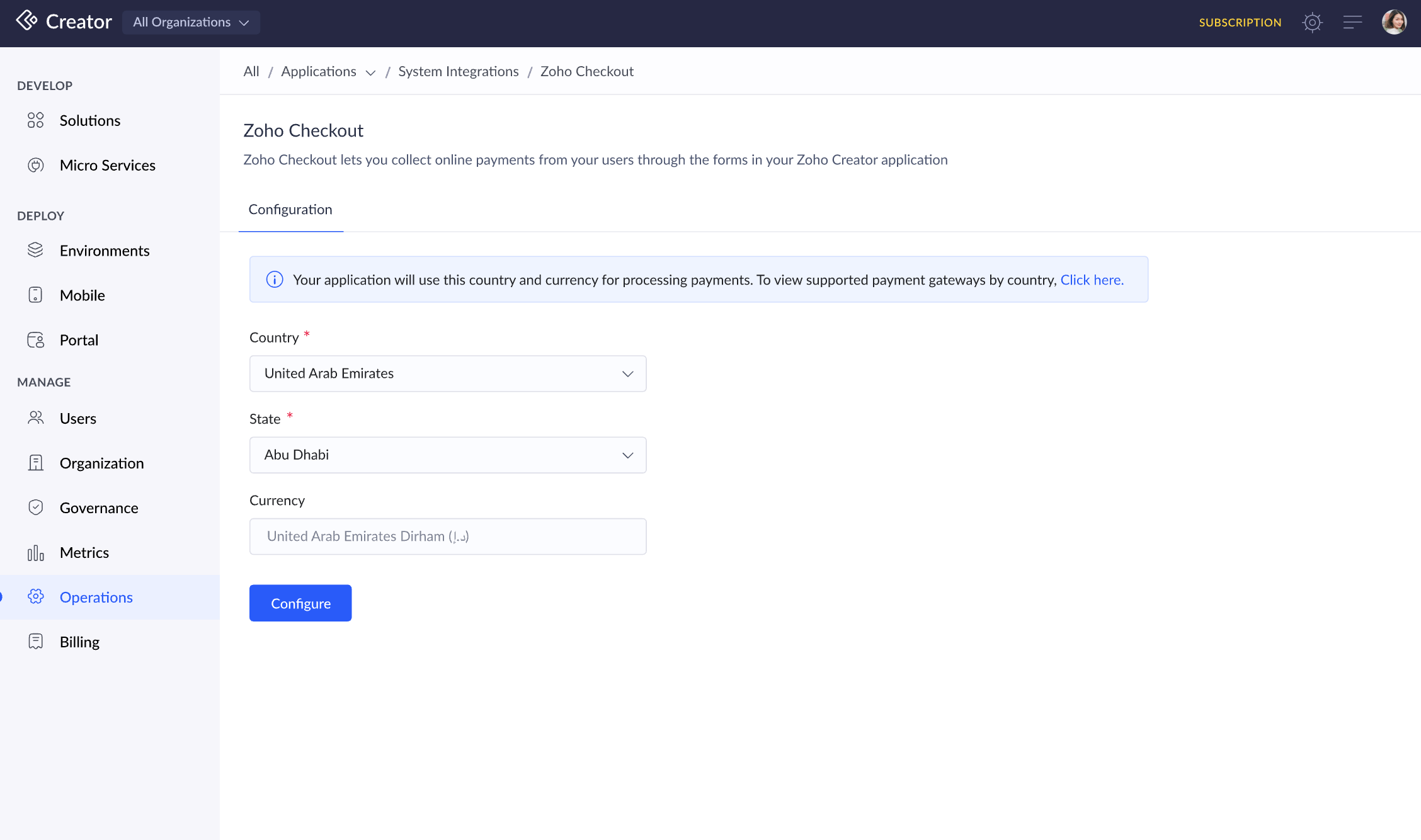 設定が完了すると、簡単に支払いワークフローを作成し、アプリケーションでオンラインの支払い取引を行うことができます。「表示する オン 決済する」をクリックすると、Zoho 決済するのサービスページに移動します。