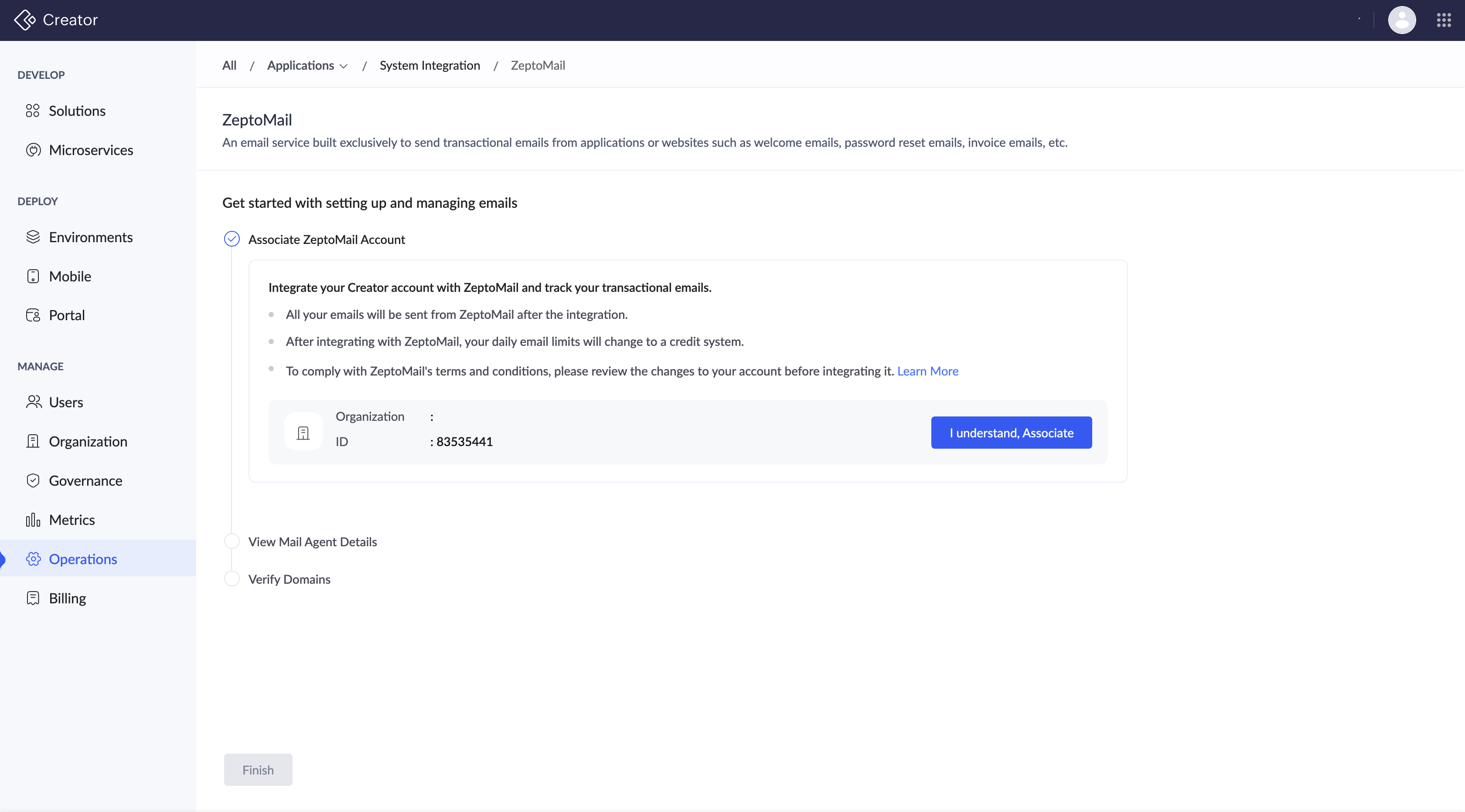アカウント連携:メールアドレスが ZeptoMail アカウントにリンクされている場合は、了解しました, 関連付けるをクリックすることで、簡単に Creator アカウントと連携できます。