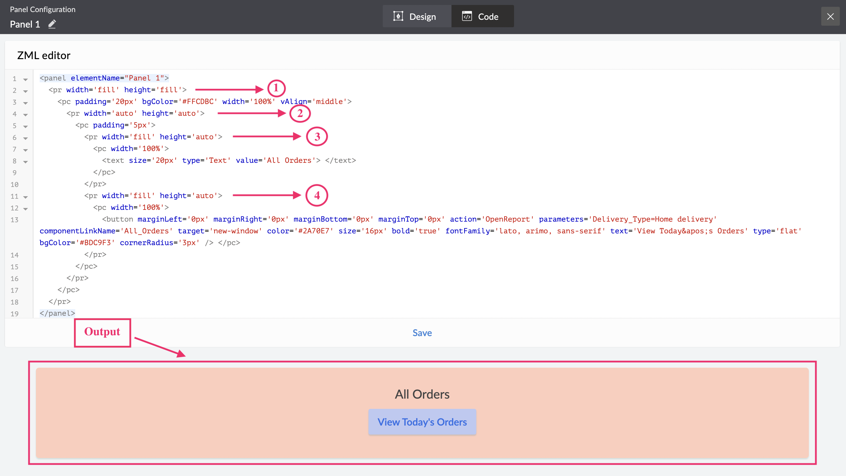 - コード タブをクリックし、パネル要素の 高さ を 自動、 埋める、または %<pr>タグ内 で指定します。 パネルのプレビューが適切に調整されます。