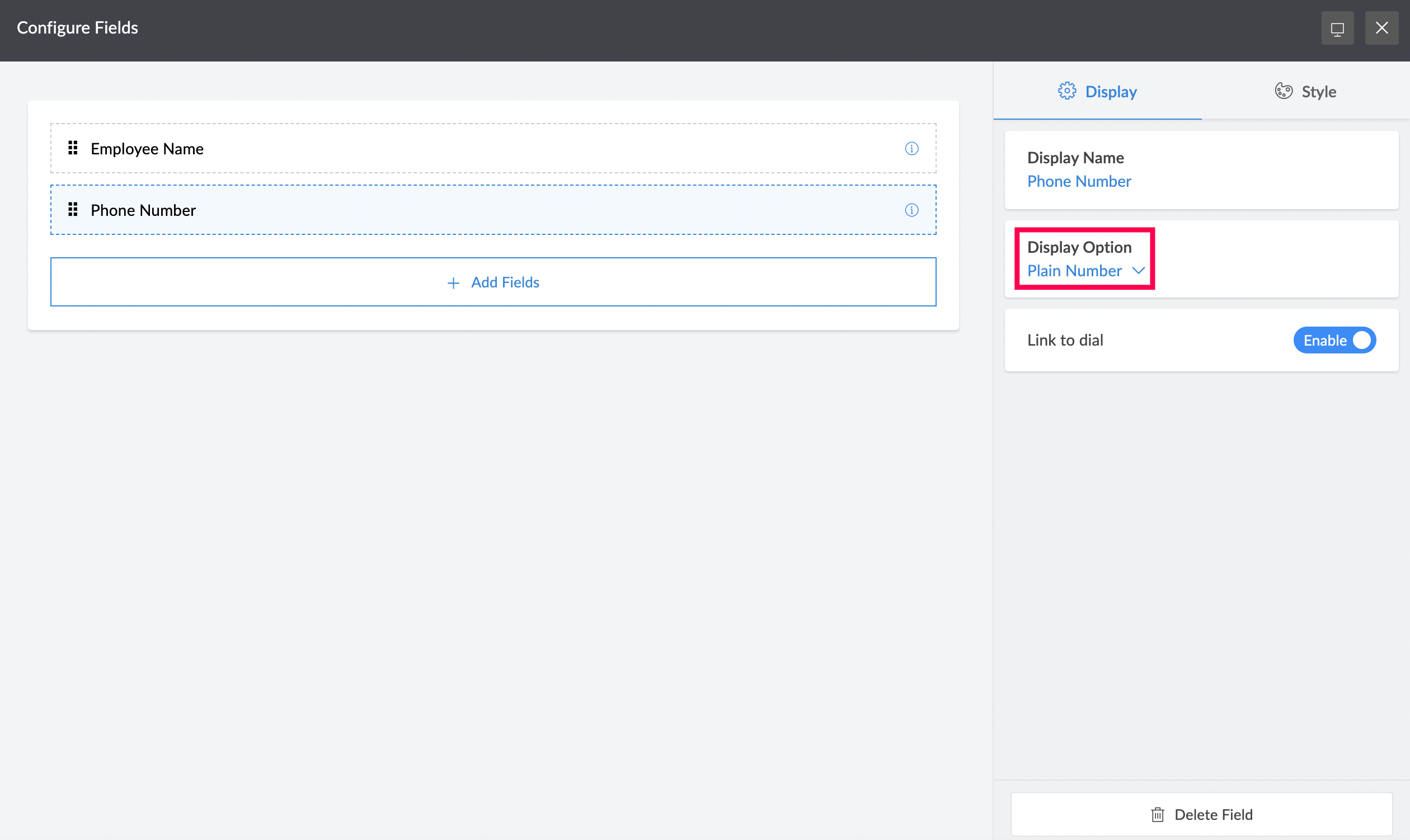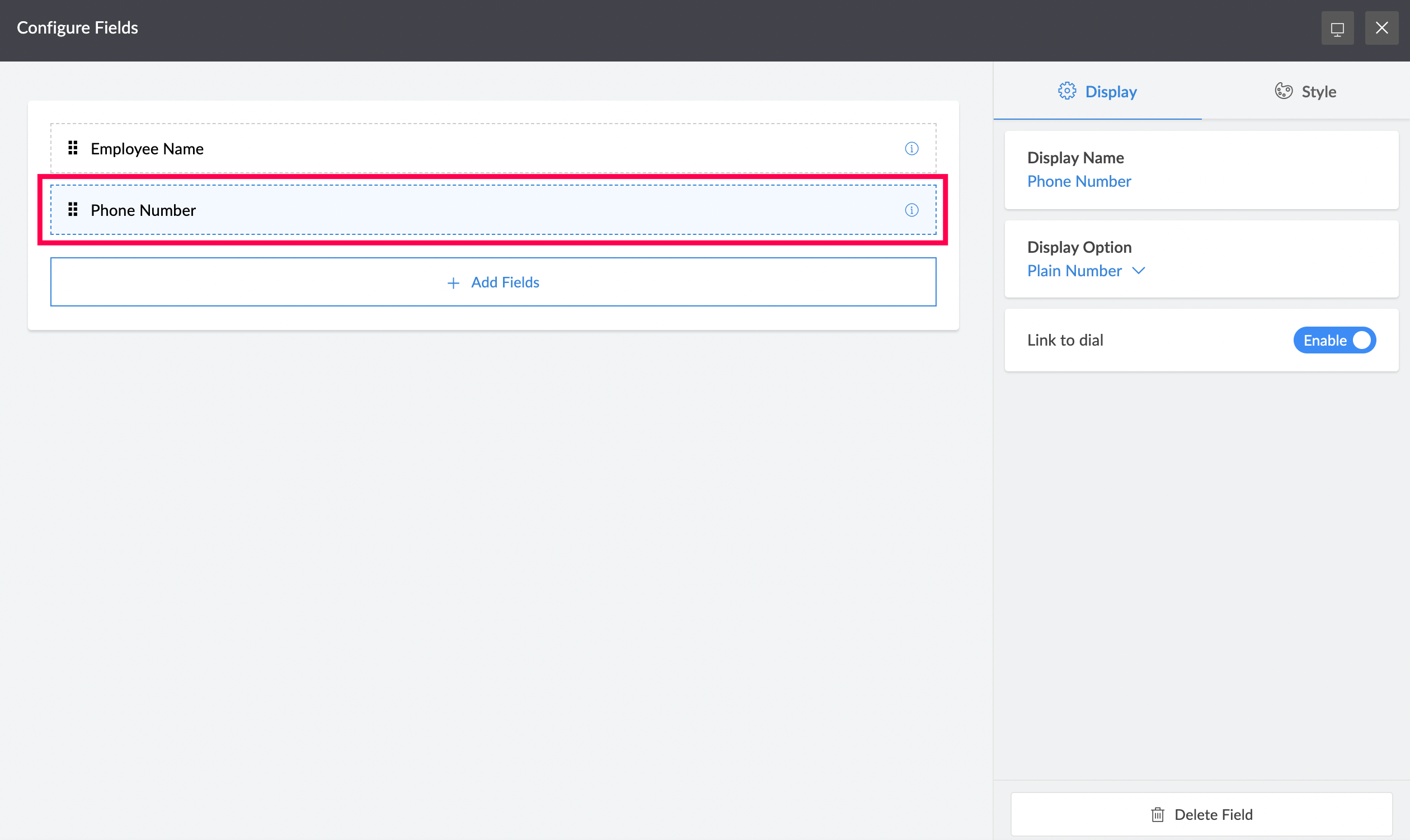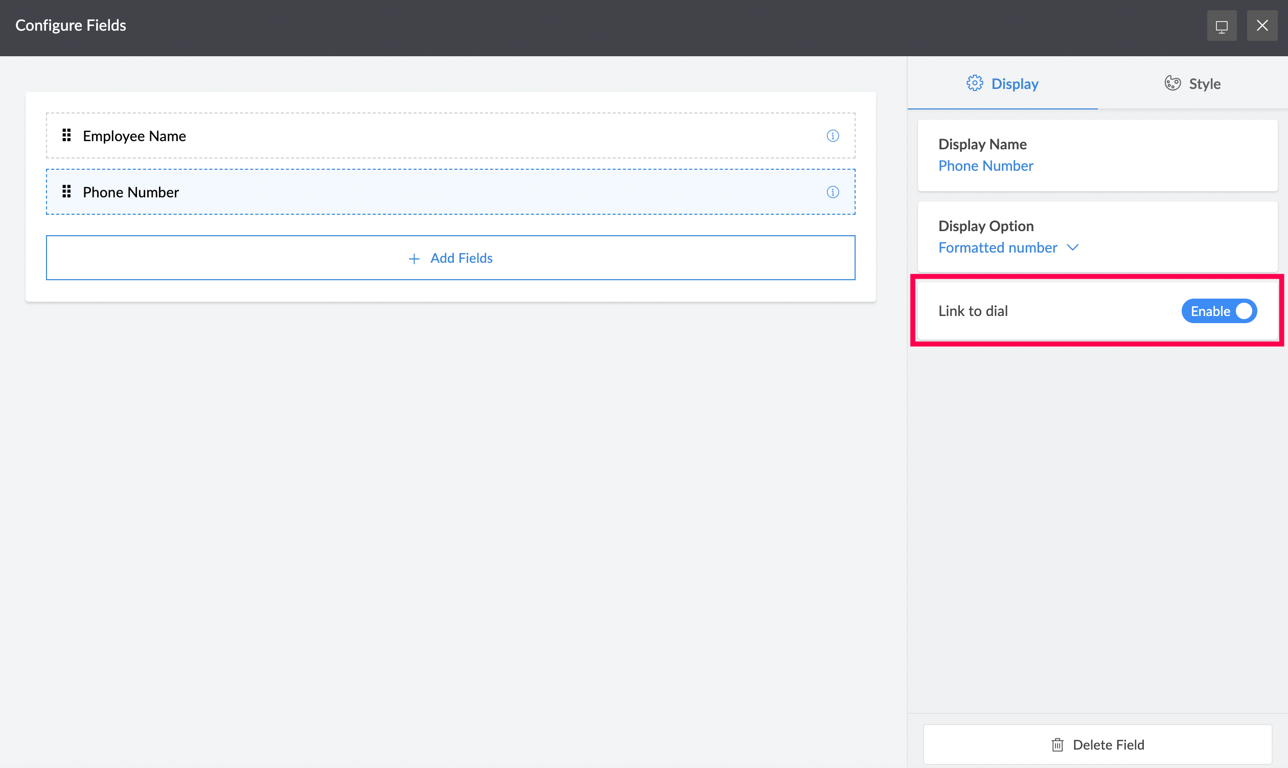 以下の手順に従って、フィールドの表示オプションとダイヤルプロパティへのリンクを定義する方法の詳細を示します。 電話番号フィールドのプロパティを設定するには: