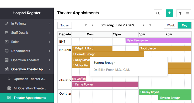 としましょう、病院の登録です。レポートは、患者、外科医、タイミング、および劇場の詳細を含む手術室の予約を表示します。要件の性質を考慮すると、レポートの名前フィールドには、接頭辞や接尾辞と共に外科医の完全な名前が表示されます。名前フィールドには次のものがあります。