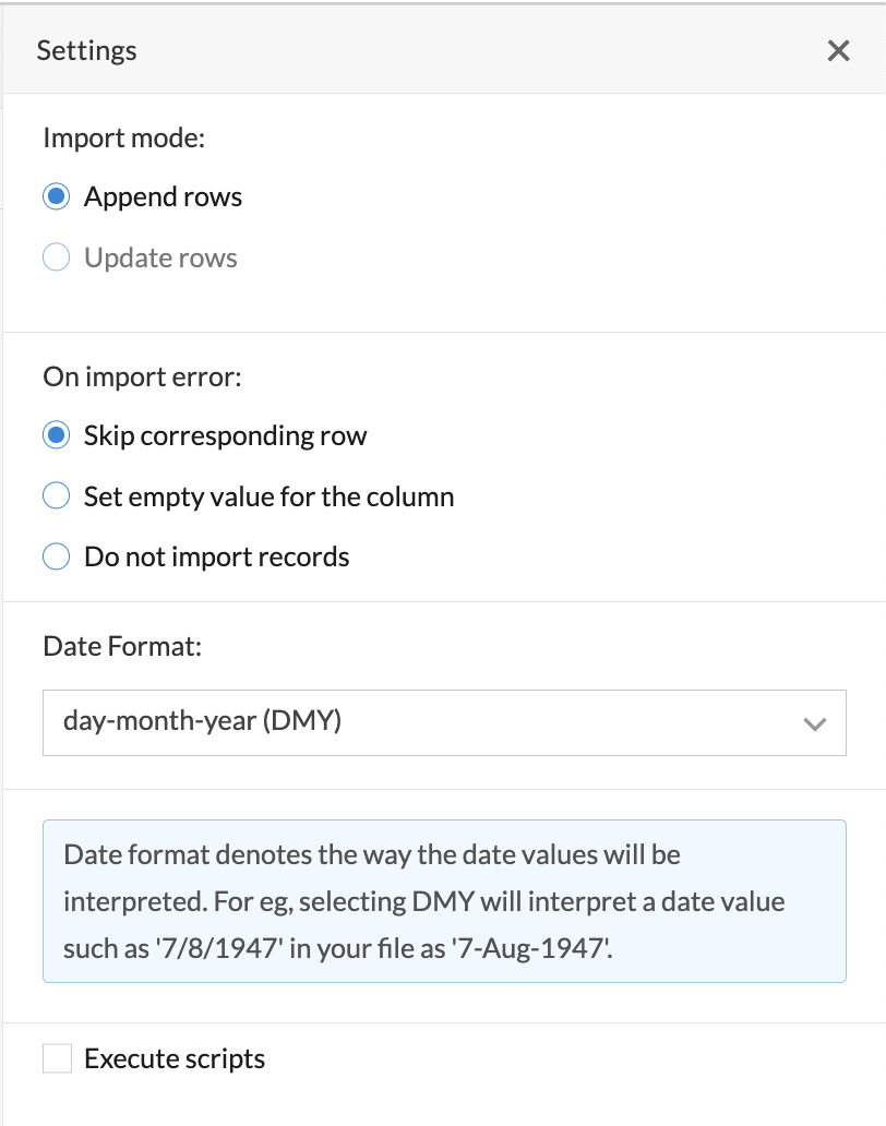インポートする設定では、インポート方法の選択、インポート中にエラーが発生した場合の動作の定義、日付値のインポート形式の設定ができます。インポートする設定を定義するには: