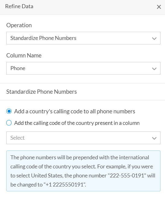 特定の国の国際電話コードを、選択した列内のすべての電話番号に付加します。例えば、国として「United 都道府県」を選択した場合、+1 が選択列内のすべての電話番号に付加されます。同様に、オーストラリアの場合は +61 が電話番号に付加されます。