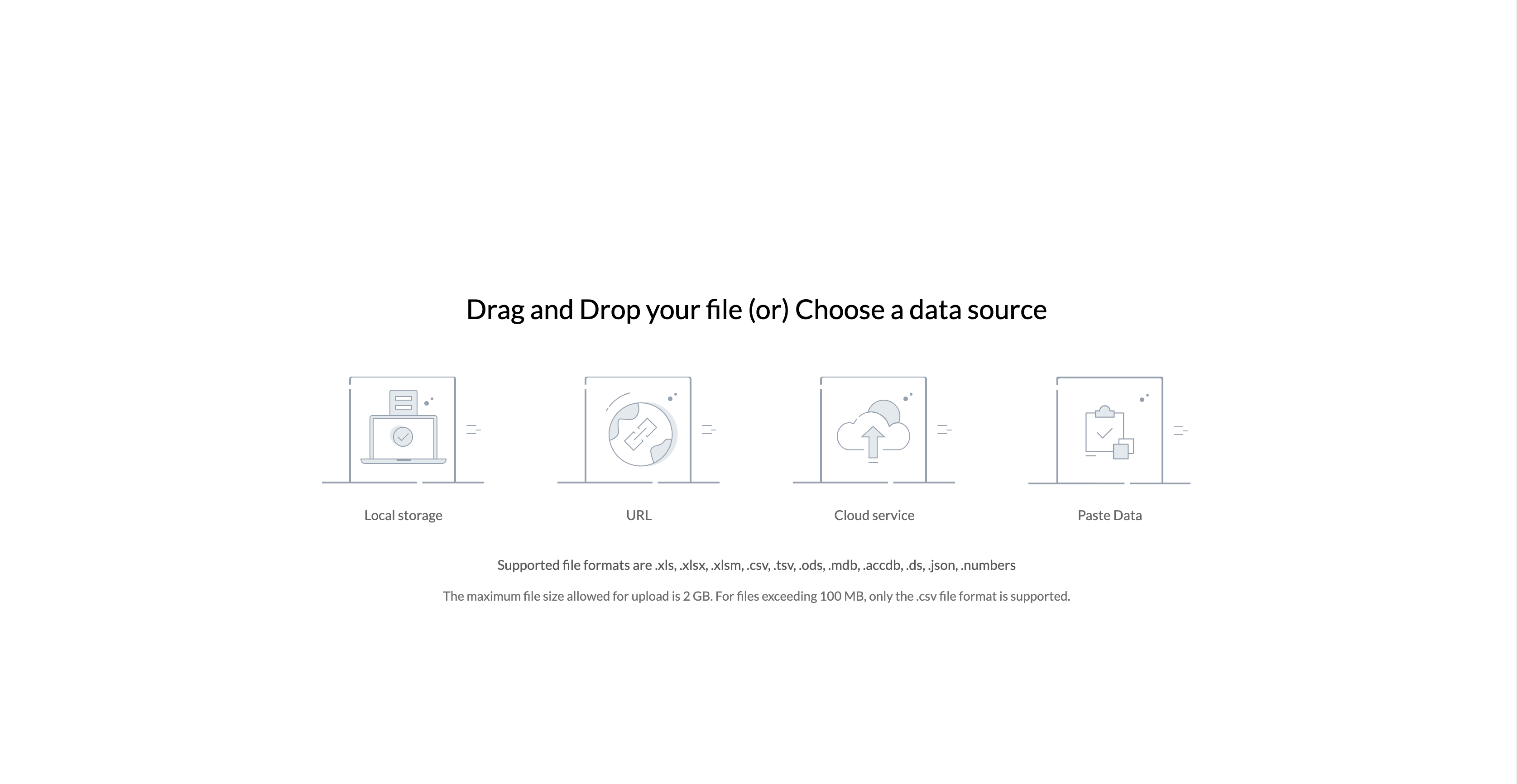 CSVファイルの場合、ファイルのサイズ上限は2GBです。その他のファイル形式の場合、上限は100MBです。