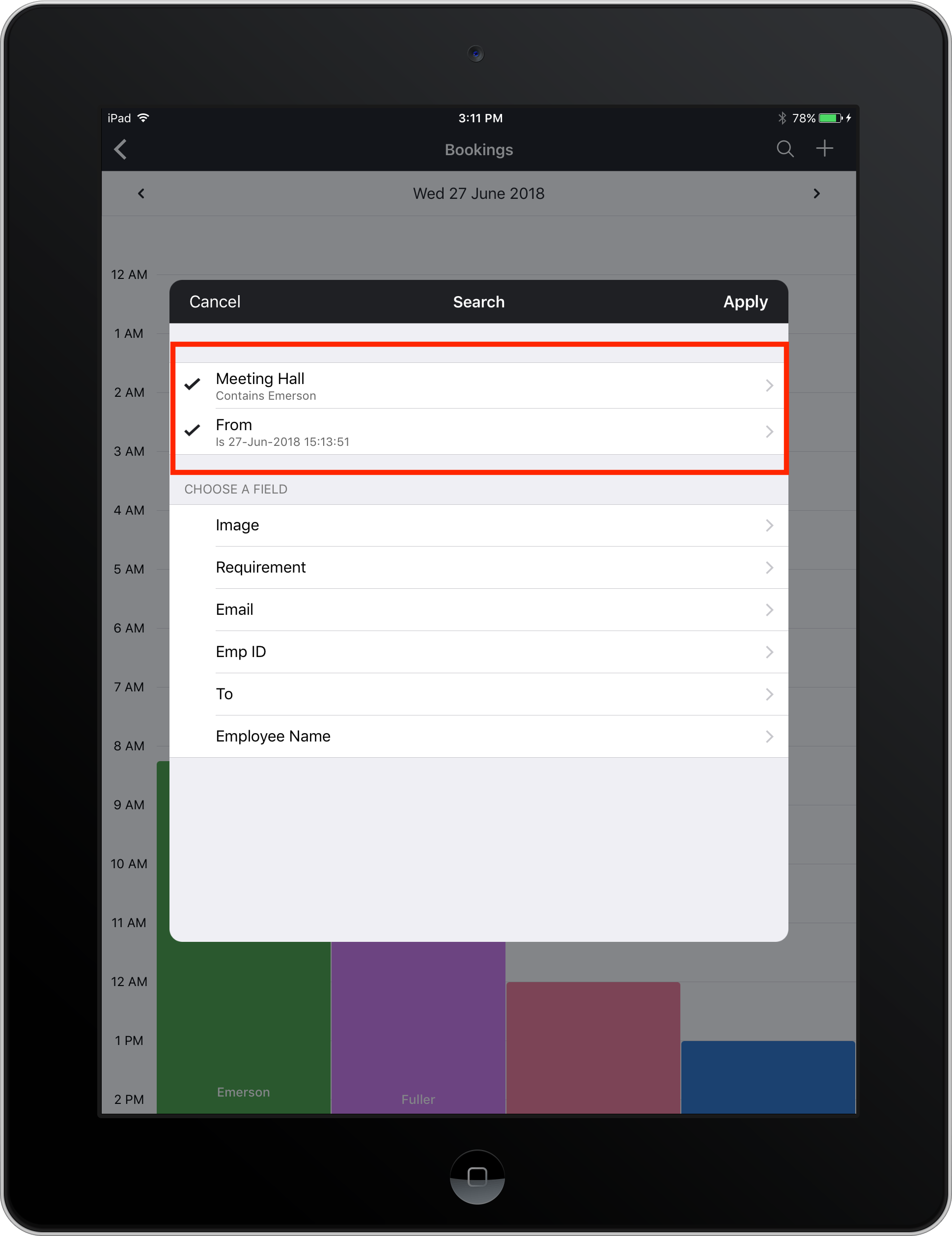 検索オプションは、多くのレコードを絞り込み、必要な情報に絞り込むのに役立ちます。 仮に会議予約アプリを持っているとしましょう。 ホールの詳細と当日の予約が表示されるレポートを持っています。 特定の時間での利用可能性を探している場合。 検索フィールドをタップします。 レポート内のすべてのフィールドがリスト表示されます。 必要なレコードを特定するのに役立つフィールドを選択します。 この場合、ホールフィールドを選択し、「is」オペレーターを選択し、ホールの名前を入力します。 日時フィールドを選択し、日付と時間を指定します。 関連するレコードが表示されます。