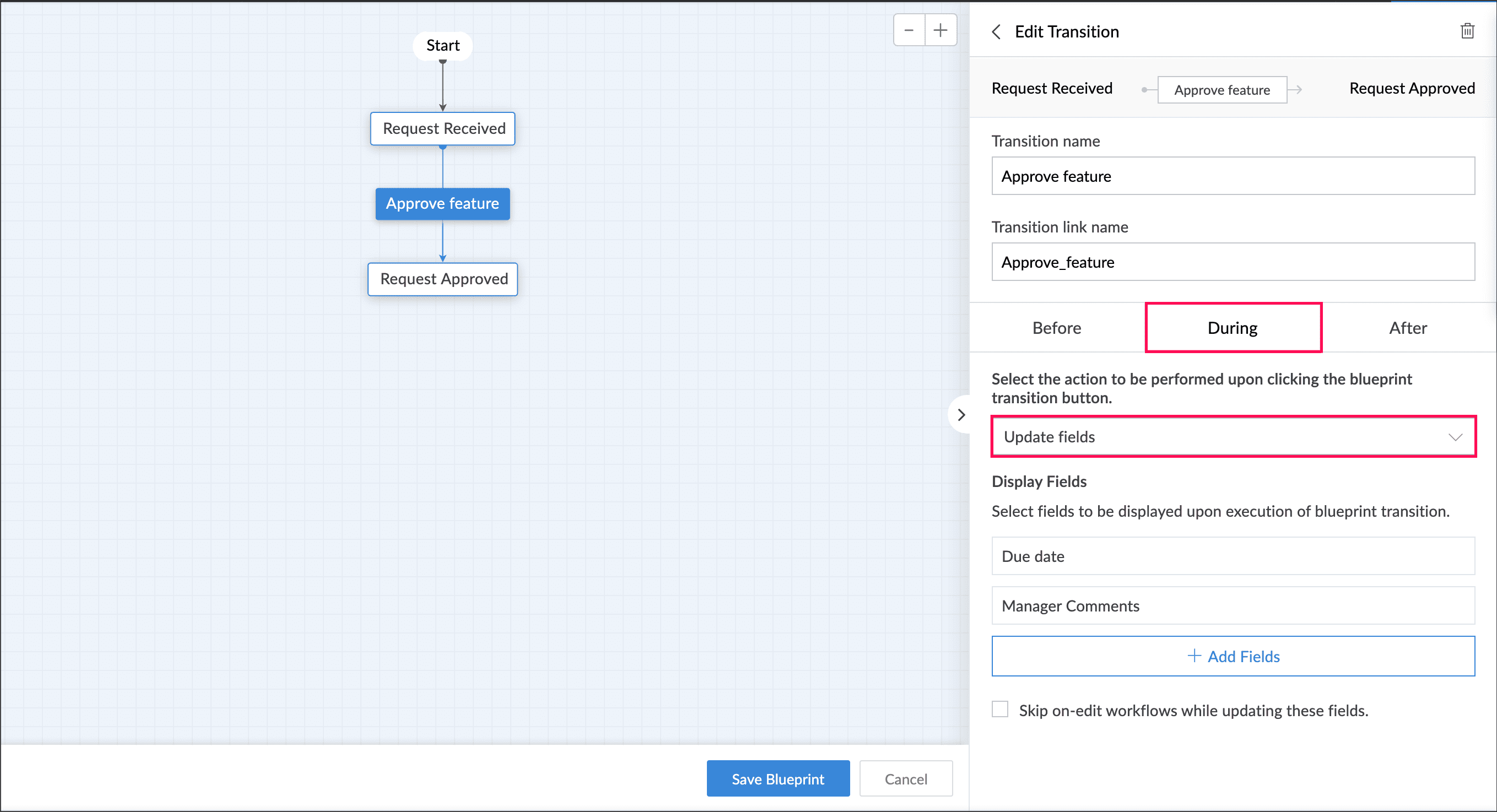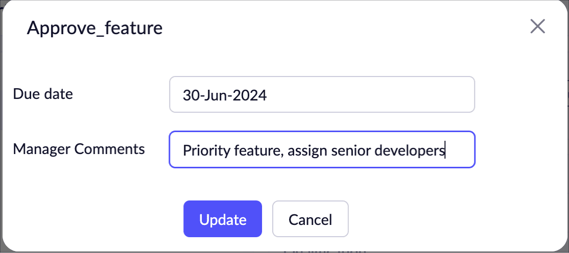 上記の例では、マネージャーが遷移操作承認する Featureを実行して機能を承認した際、他の項目(期限、manager コメント)も更新できます。