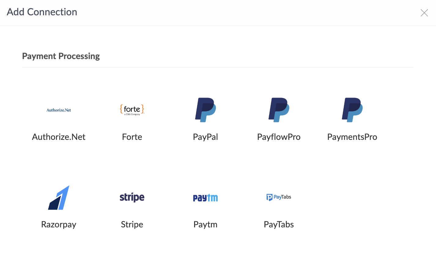 支払いワークフローを作成する前に、サポートされている決済サービスのいずれかと連携した支払いコネクションを追加する必要があります。これは一度だけ行う作業です。一度決済方法を設定すると、そのコネクションがZoho Creatorアカウントに追加されます。追加されたコネクションは、アプリケーション内で設定するすべての支払いワークフローの初期設定決済方法として利用されます。アカウント内の支払い連携を表示・変更したい場合は、アカウント設定 → 拡張機能 → 外部連携へ移動してください。