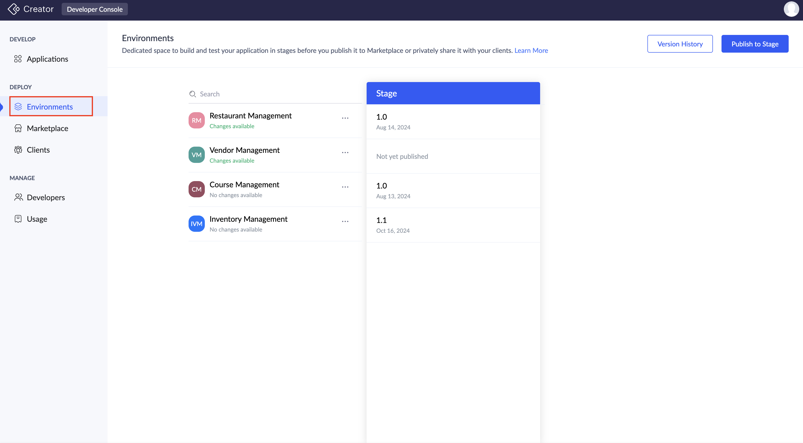 開発者コンソールでは、環境はZohoプラットフォーム内のアプリケーション開発と管理の特定のニーズに合わせてカスタマイズされています。開発者コンソールは、DevelopmentとStageなどの異なる環境を提供し、開発者がクライアントのアプリケーションに影響を与えることなく変更を作業しテストできます。この分離により、開発者は効率的に実験し問題を解決しアップデートの準備ができます。