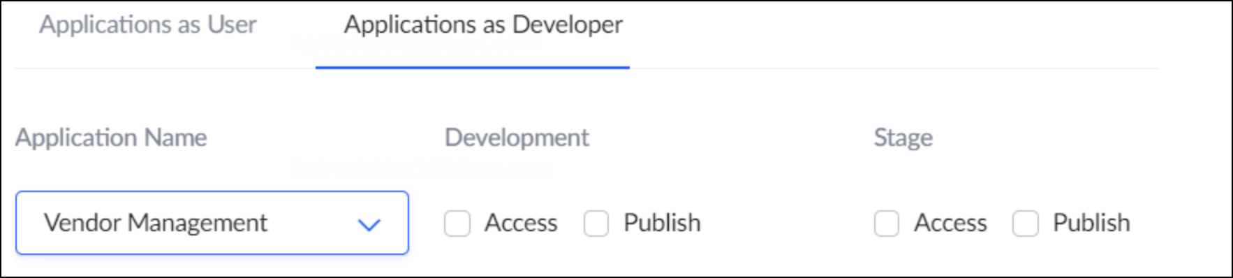 - 同様に、Stage項目でステージ環境においてユーザーに付与する権限を選択します。設定可能な権限は「アクセス」と「公開」です。いずれかまたは両方を選択できます。アクセスはステージアプリケーションの閲覧のみ、公開はバージョンを本番環境へ公開する権限を与えます。