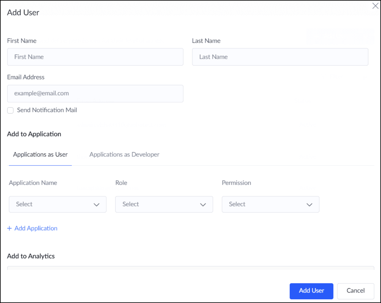 - ユーザー追加タブが表示されます。ユーザーの名前、メールアドレス、その他の詳細を入力してください。