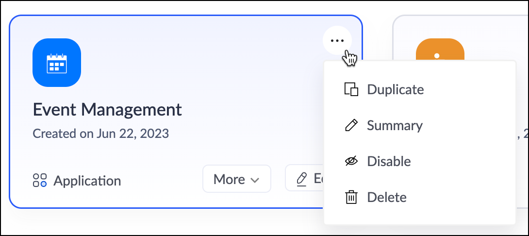 アプリケーションを複製したり概要を表示したりする場合は、ホーム画面右上のミートボール(三点)メニューを選択し、「複製」オプションを選んでください。