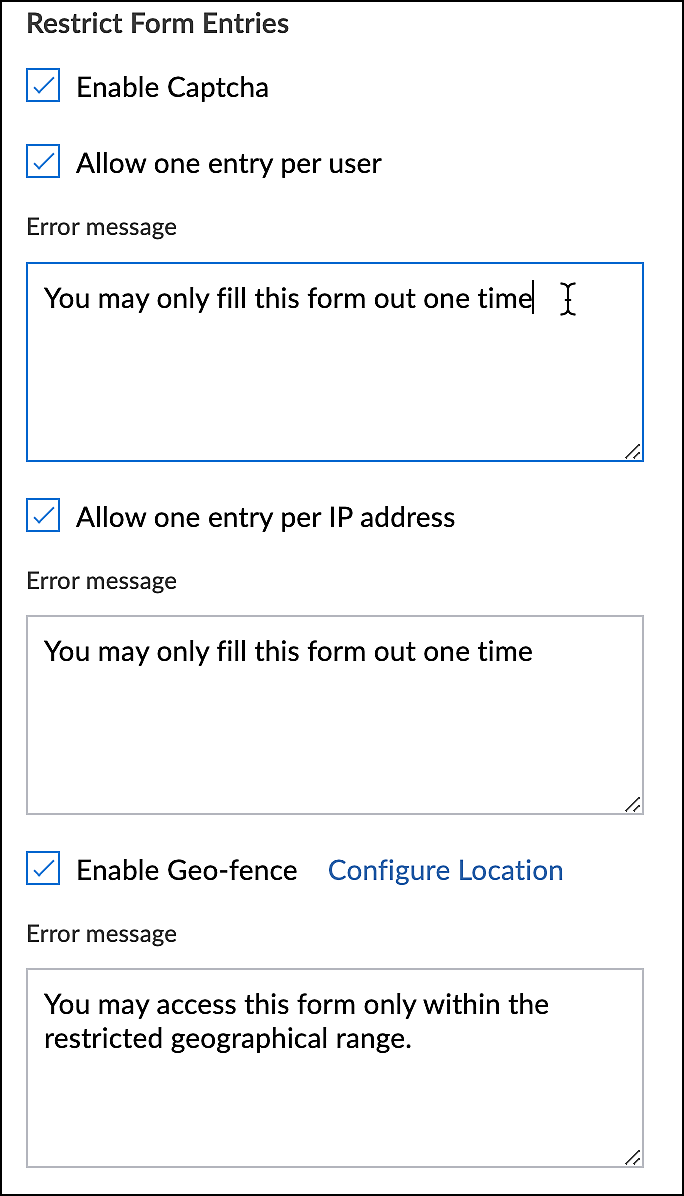 ユーザーが同じ公開IP住所から再度フォームにアクセスしようとした場合、フォームは表示されません。代わりに、1回のみフォームを入力できる旨のメッセージが表示されます。