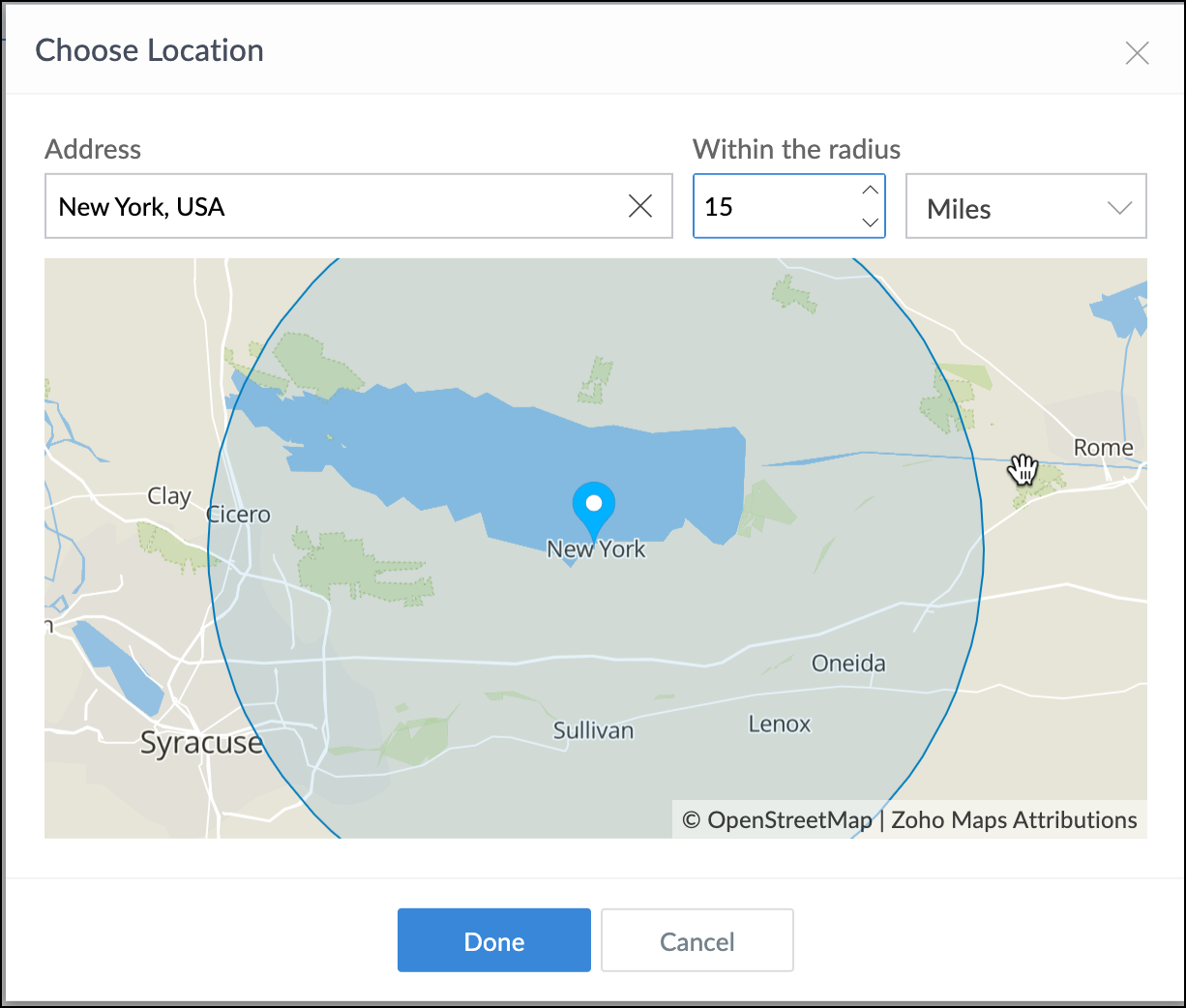 - 場所を選択し、必要に応じて半径を調整します。