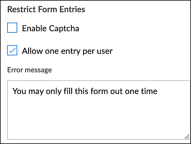 フォームへの入力を1ユーザーにつき1回に制限できます。ユーザーが2回目にフォームへアクセスすると、フォームは表示されません。代わりに、初期設定のメッセージ「このフォームは1回のみ入力できます」と表示されますが、このメッセージはカスタマイズ可能です。