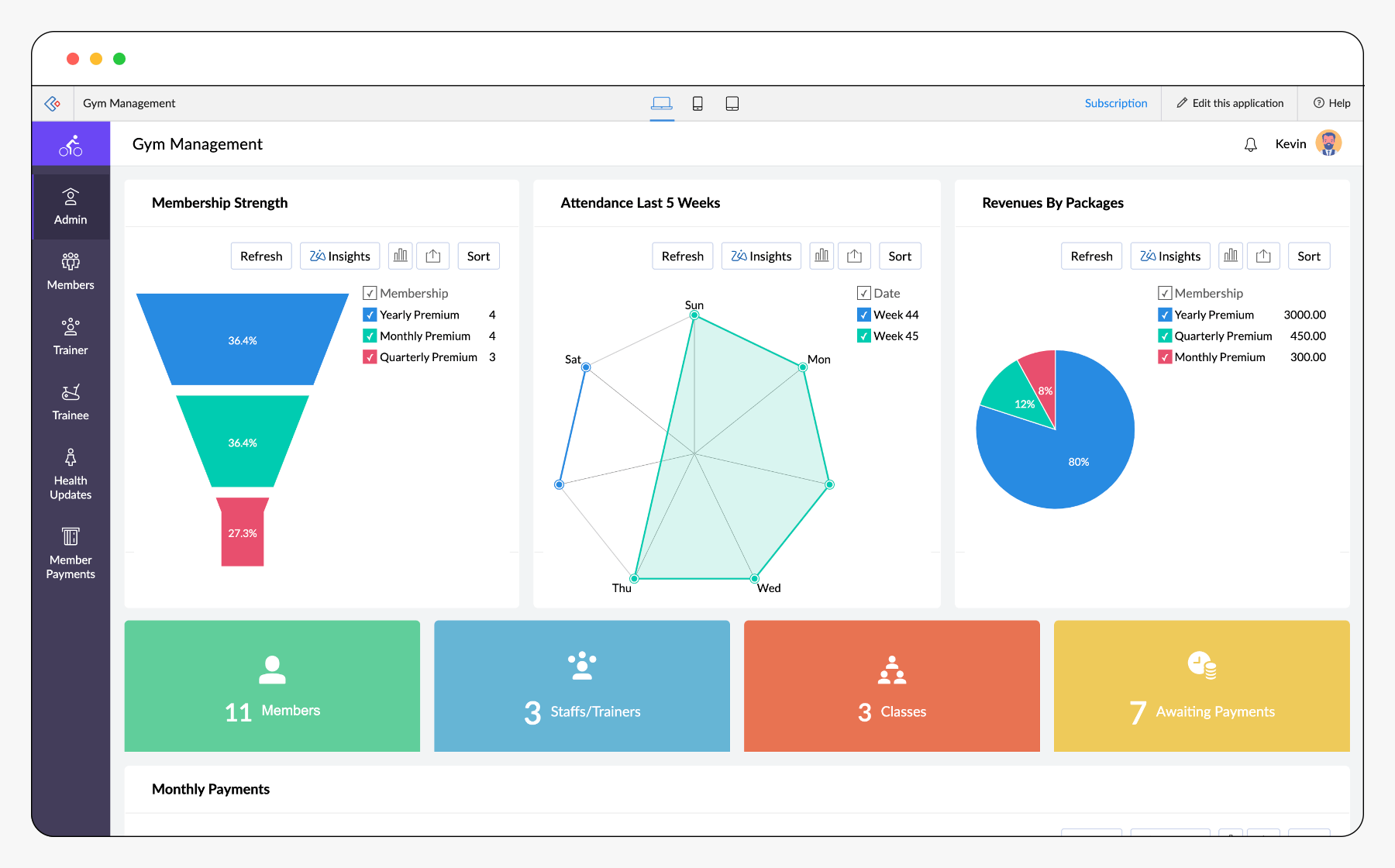 このアプリケーションにより、ジムの会員登録から更新、支払い処理まで、クライアント管理全体がシームレスに行えます。新しいトレーニングセッションの開始、スタッフの稼働状況の確認、クラスのスケジュール変更も、シンプルなドラッグ&ドロップ操作で完了します。