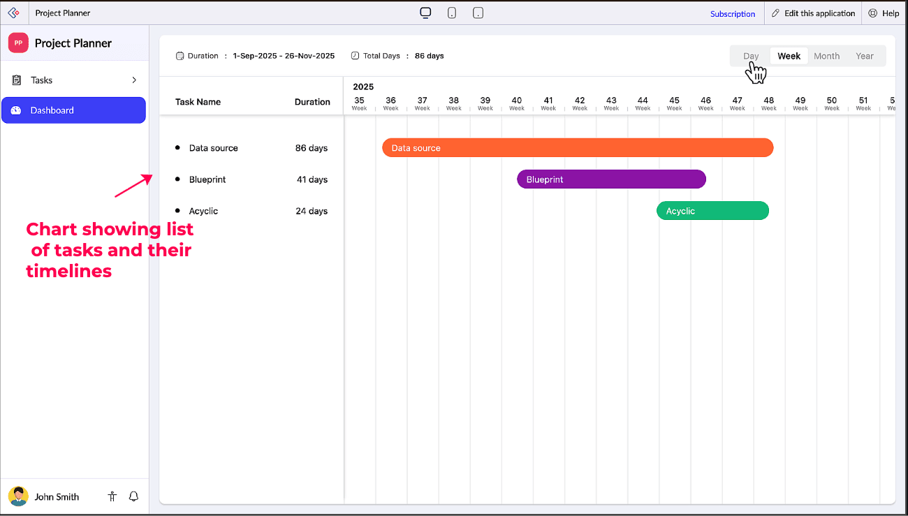 開始日と終了日を含むシンプルなタスク一覧を表示するチャートです。タスクのタイムラインのみを表示したいフォームに最適です。