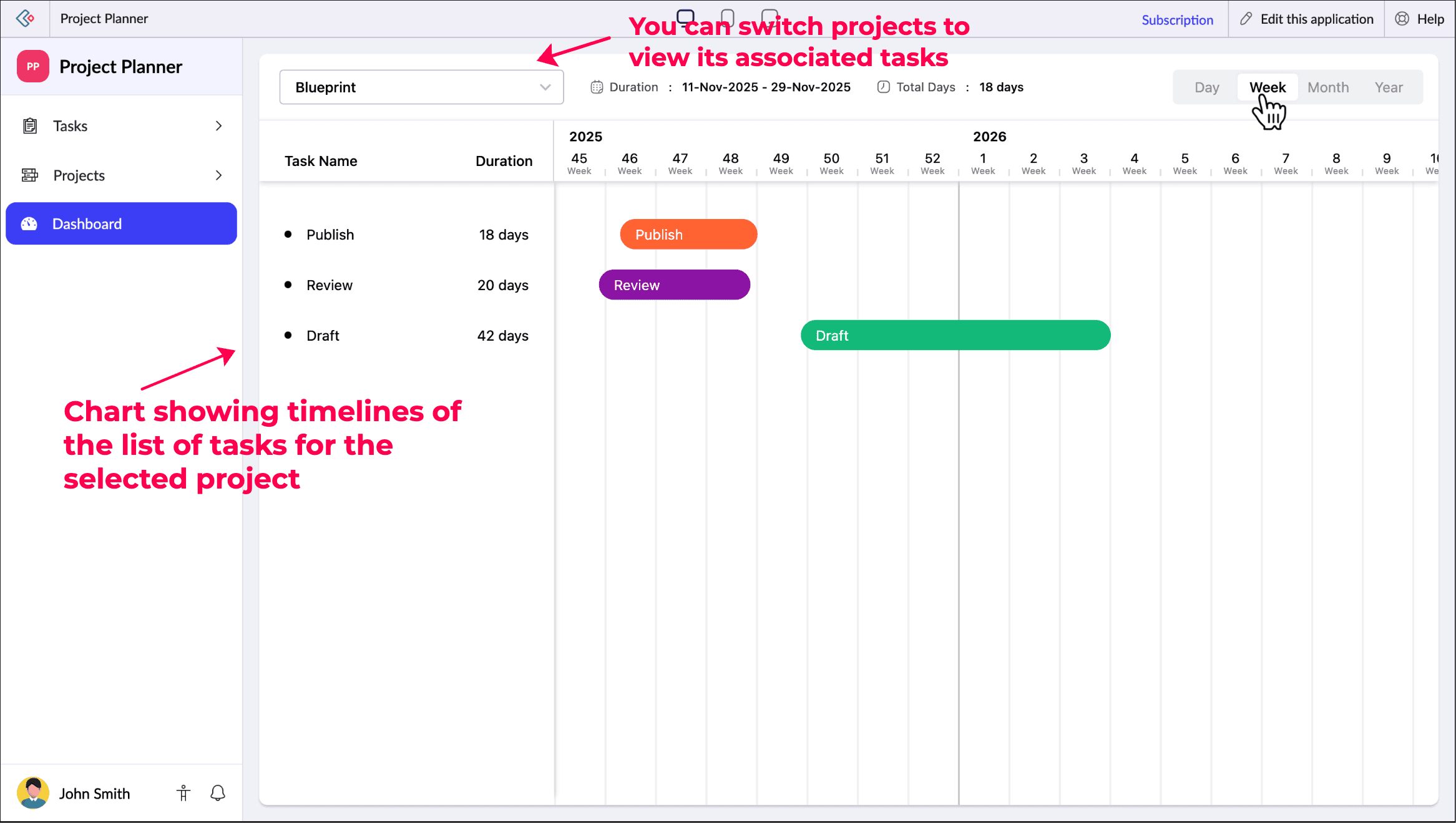 プロジェクトのタイムラインを毎日、週単位、月間、年間など、さまざまな期間で表示できます。