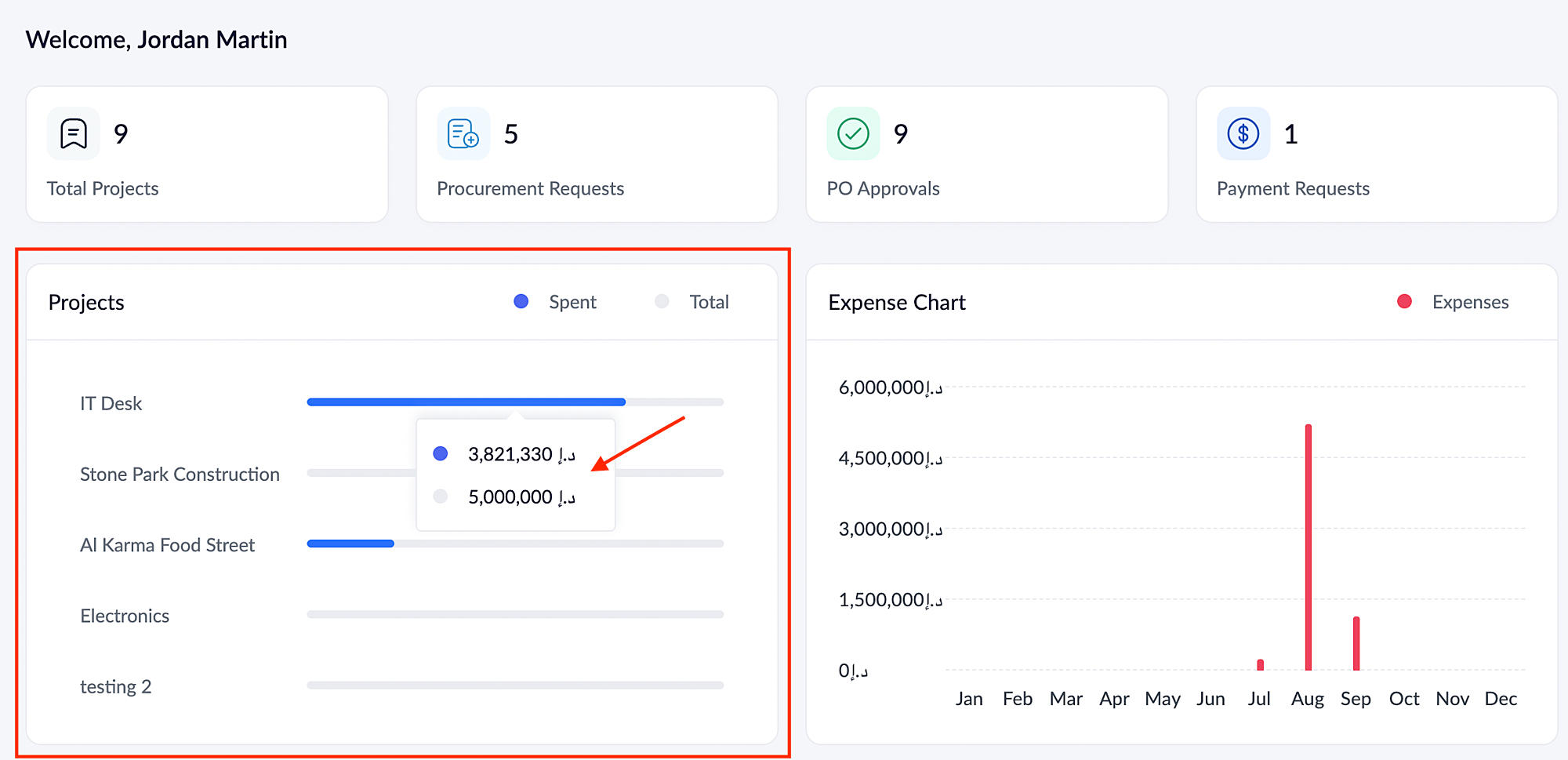 例: ダッシュボードでは、各プロジェクトとその合計予算、これまでの支出額がひと目でわかります。明確なデータ表示により、経理チームは全体の財務判断を適切に行えます。