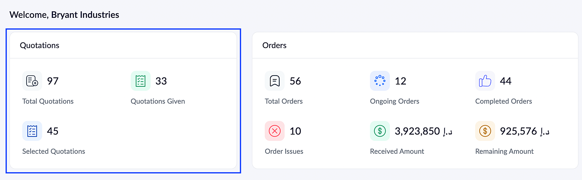 例:仕入先は主に調達リクエストに対して見積もりを提供する役割を担っています。ダッシュボードの一目でわかる表示では、合計件数の見積もりと、それぞれの提出済み・選択済み見積もりが明確に示されるため、通話から操作までのプロセスをより迅速に進めることができます。