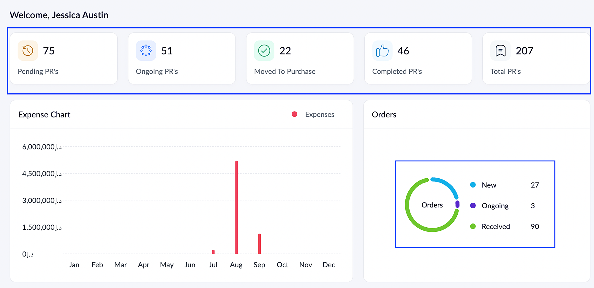 例: 調達ダッシュボードでは、各ステータス(保留中、進行中、購入手続き済み、完了、および合計)ごとのPRや、対応すべきPOがグラフィカルにわかりやすく表示されます。直感的な画面設計により、必要な情報をすぐに探し出し、業務効率化を図れます。