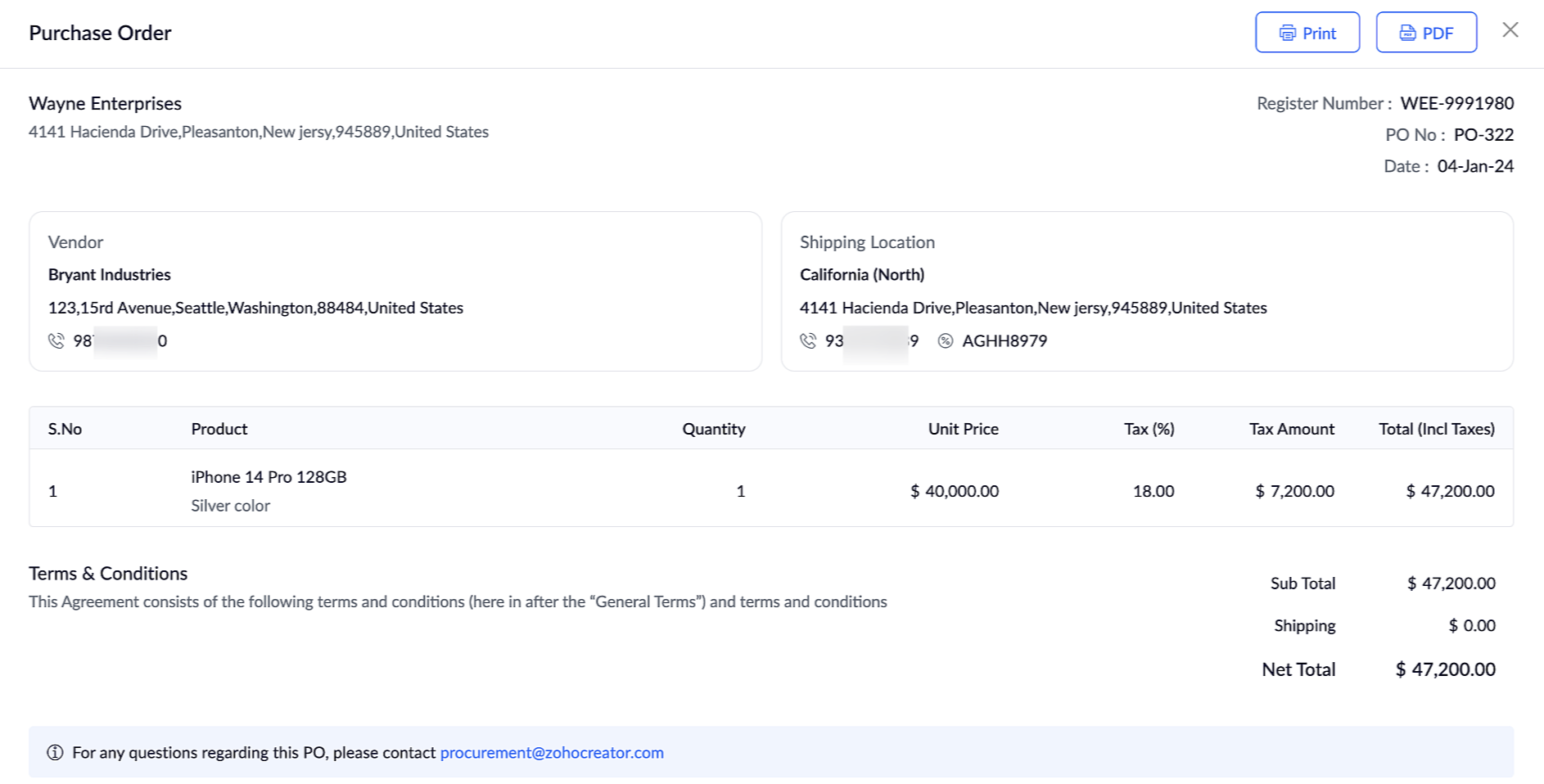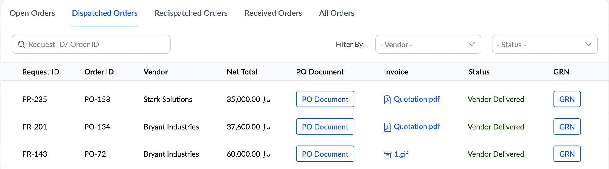 チームは、出荷済み・再出荷済みの注文を「物品受領済みメモ(GRN)」とともに、また完了した注文をZoho Creator Procurementで個別に追跡できます。